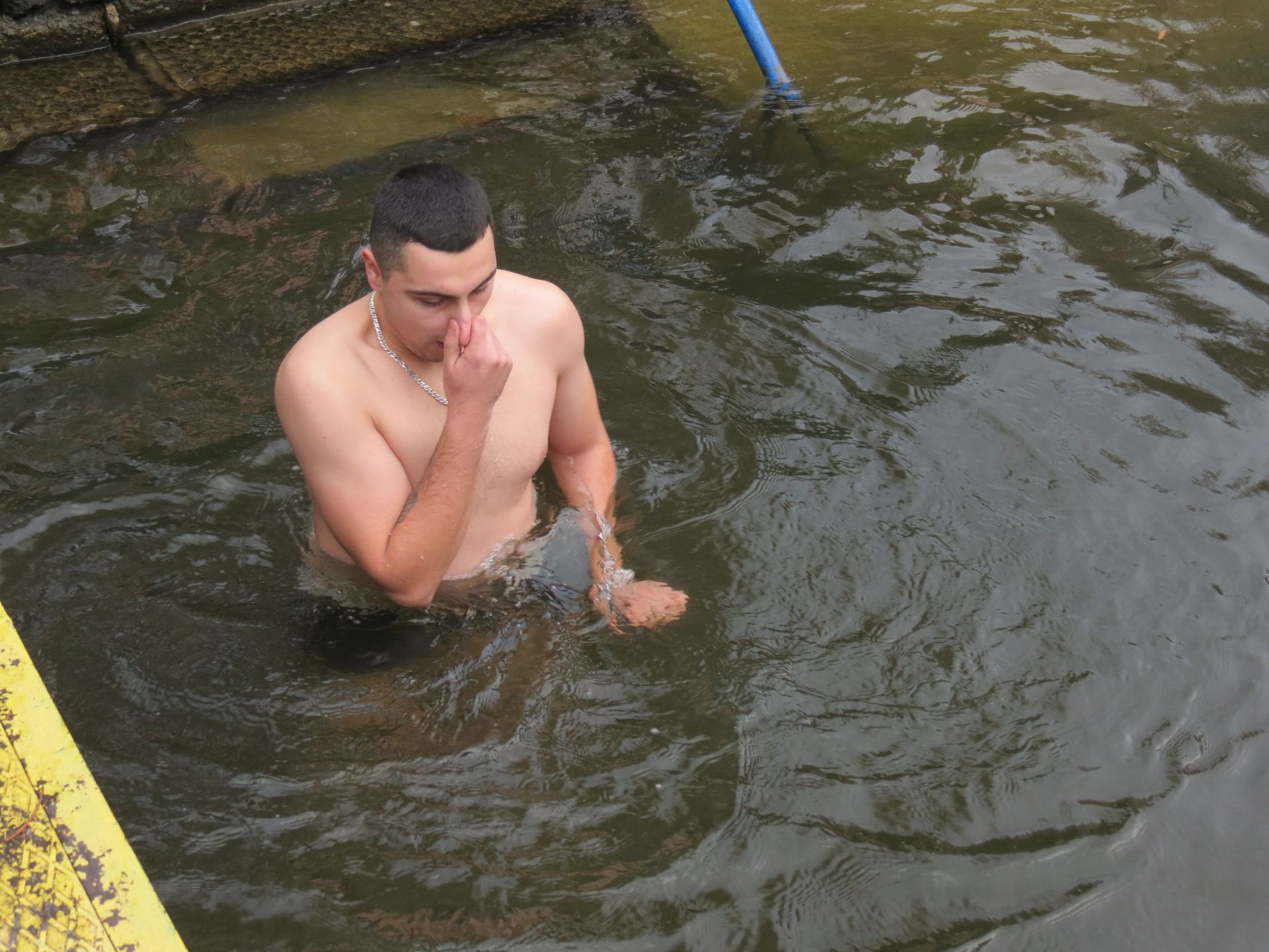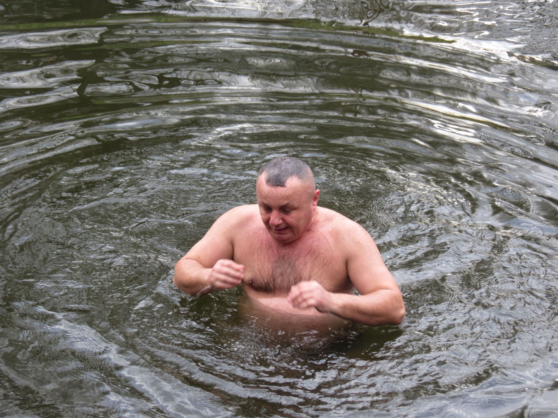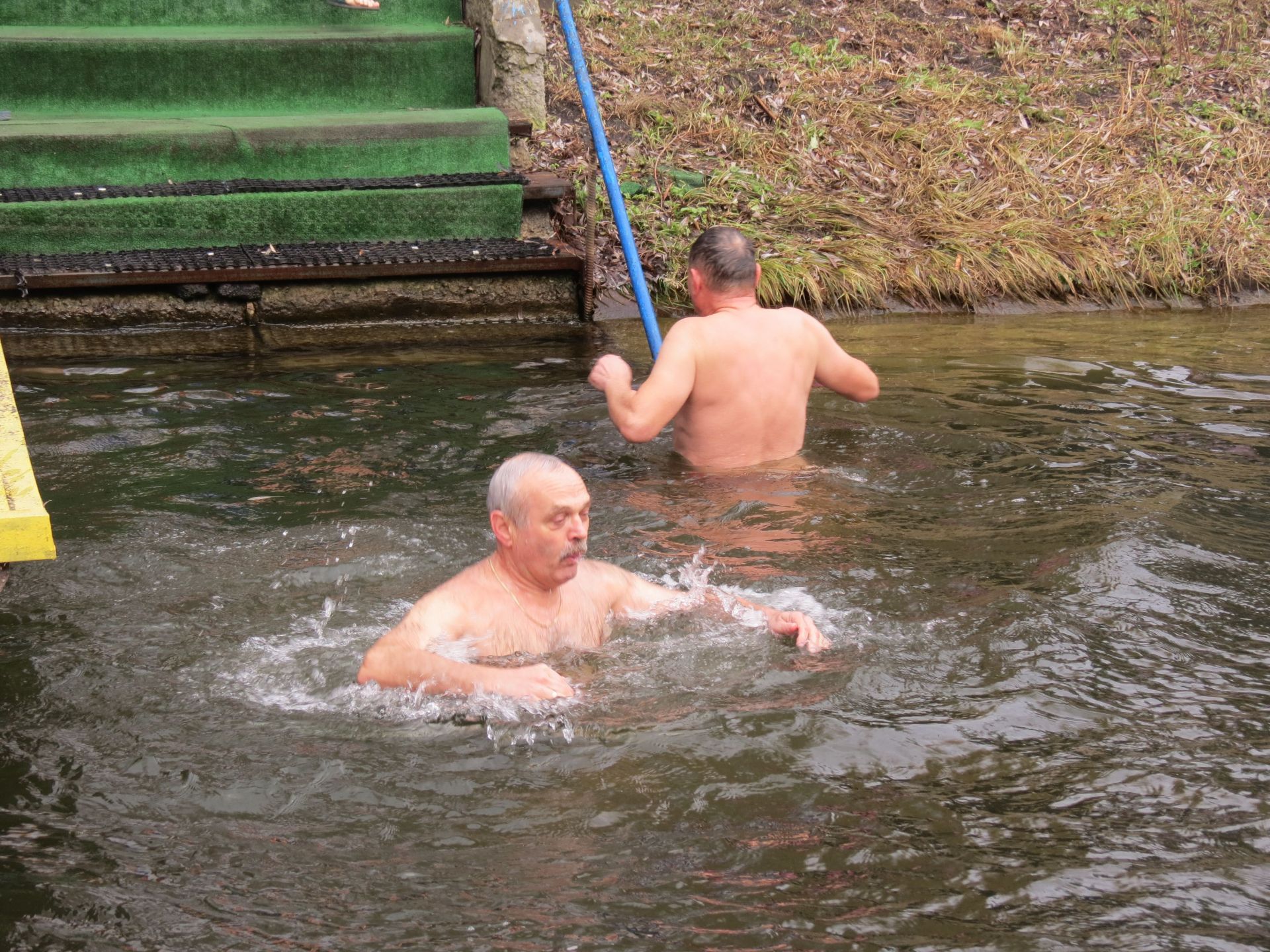 Першими після освячення занурились постійні учасники клубу. Серед них – 84 річний Микола Табачук. Він працює вчителем фізики і вже 35 років загартовується.