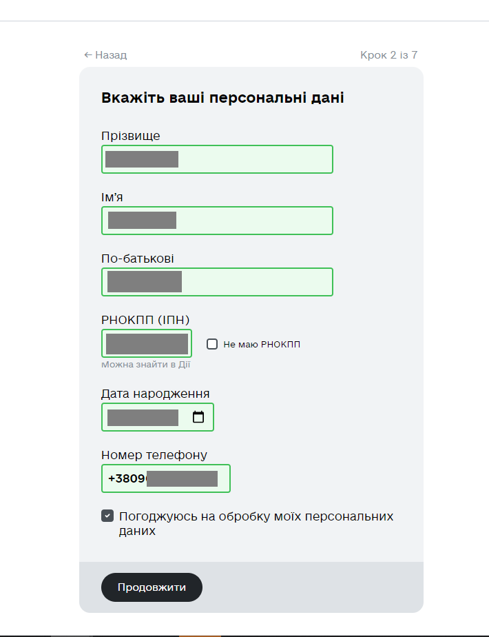 Заповнюємо персональні дані: ПІБ, індивідуальний податковий номер, дату народження, контактний номер телефону.