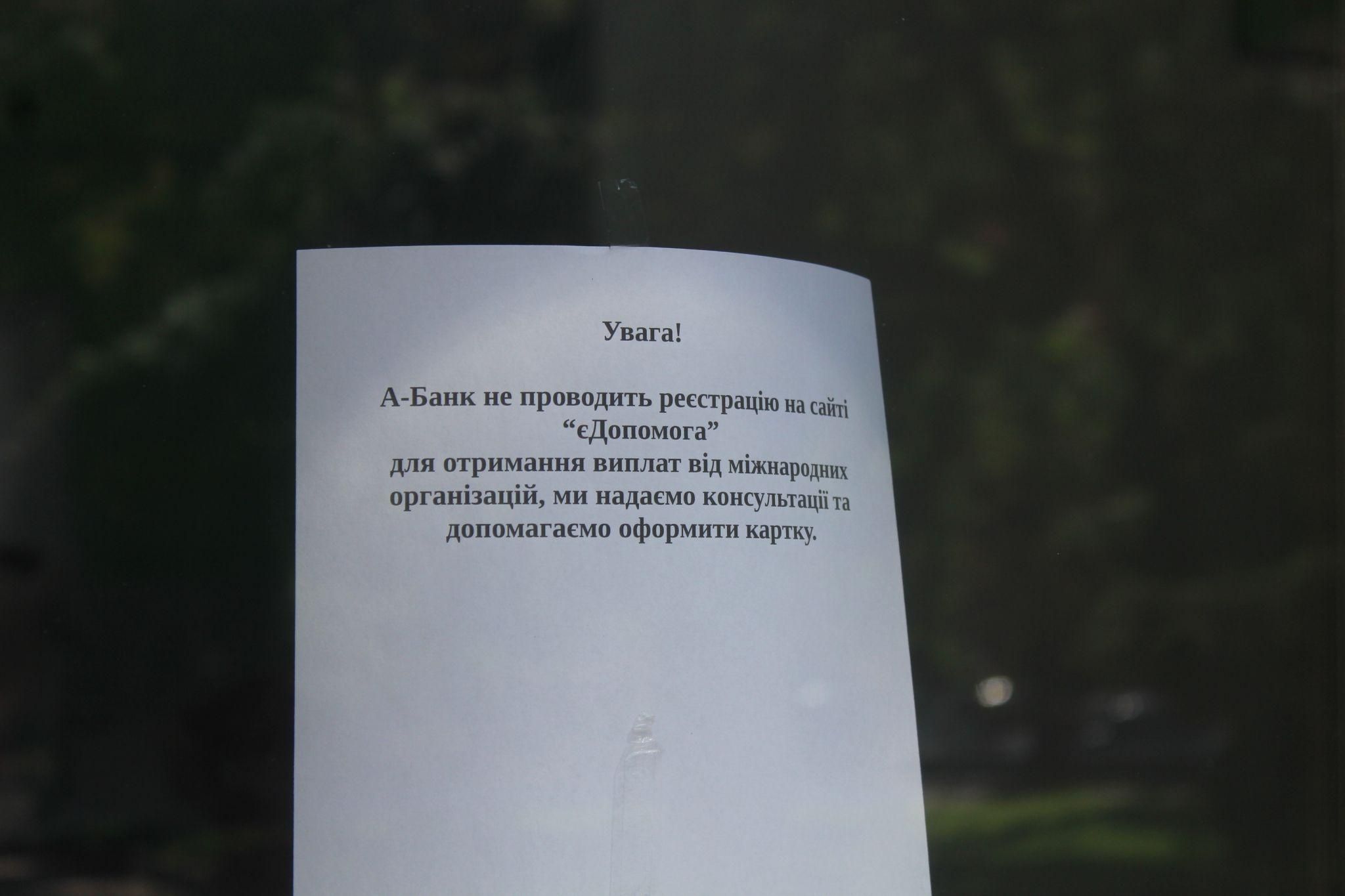 Біля відділення «А–Банку» черги також не було. На дверях оголошення, що у банку надають консультації про реєстрацію на виплату допомоги та оформлення рахунку.