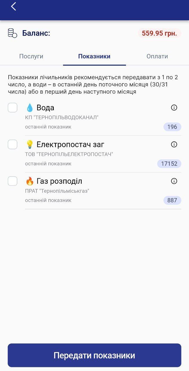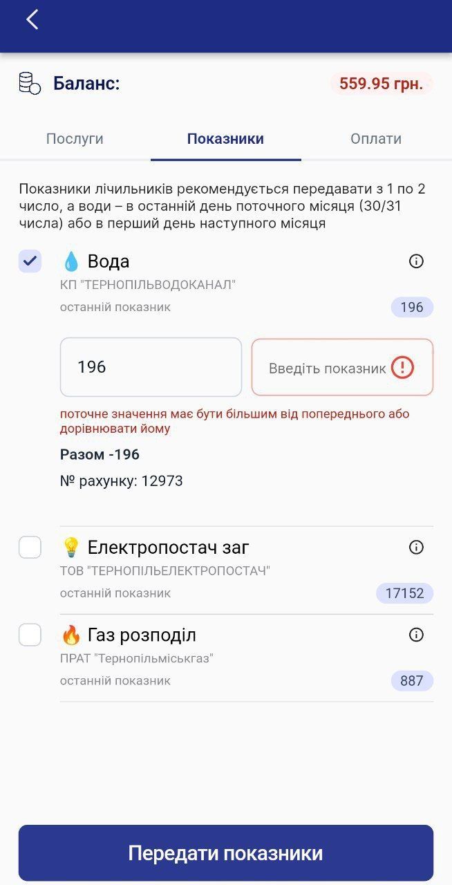Ви можете ввести показники лічильника води, газу та електрики. Також можна переглянути останній показник.