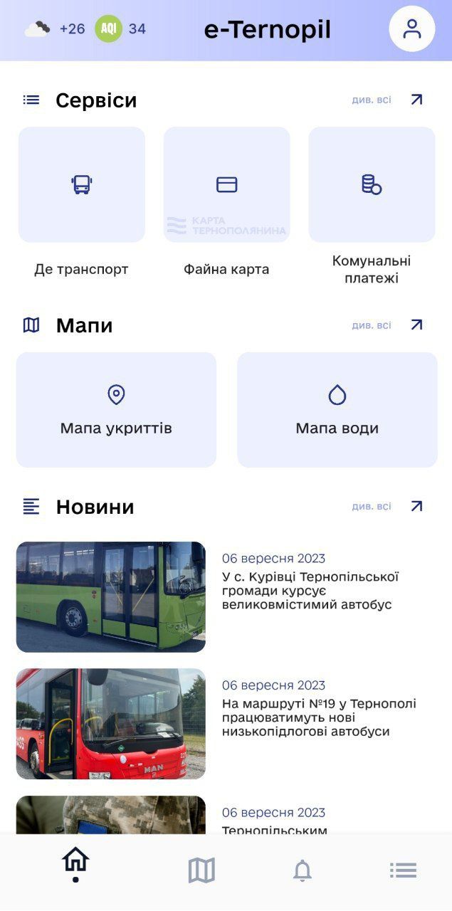 За допомогою мобільного застосунку е-Тернопіль можна користуватися різними сервісами. До прикладу, стежити за прибуттям громадського транспорту на зупинку, перевіряти баланс «файної картки». Також у застосунку є різні інтерактивні карти – мама укриттів, розташування колонок-качалок, мапа закладів, що працюють під час відключення світла, тощо.