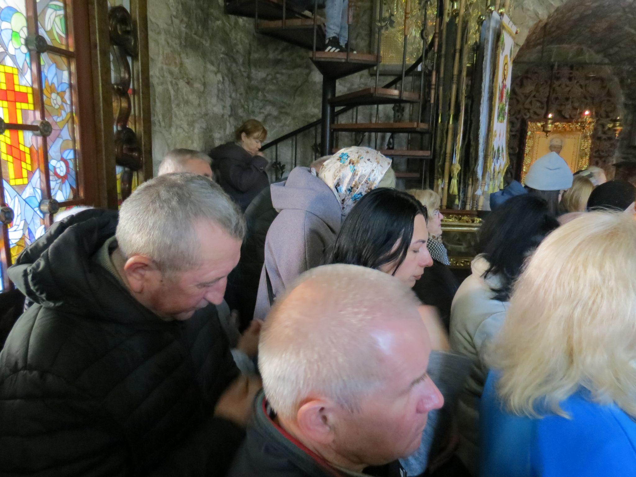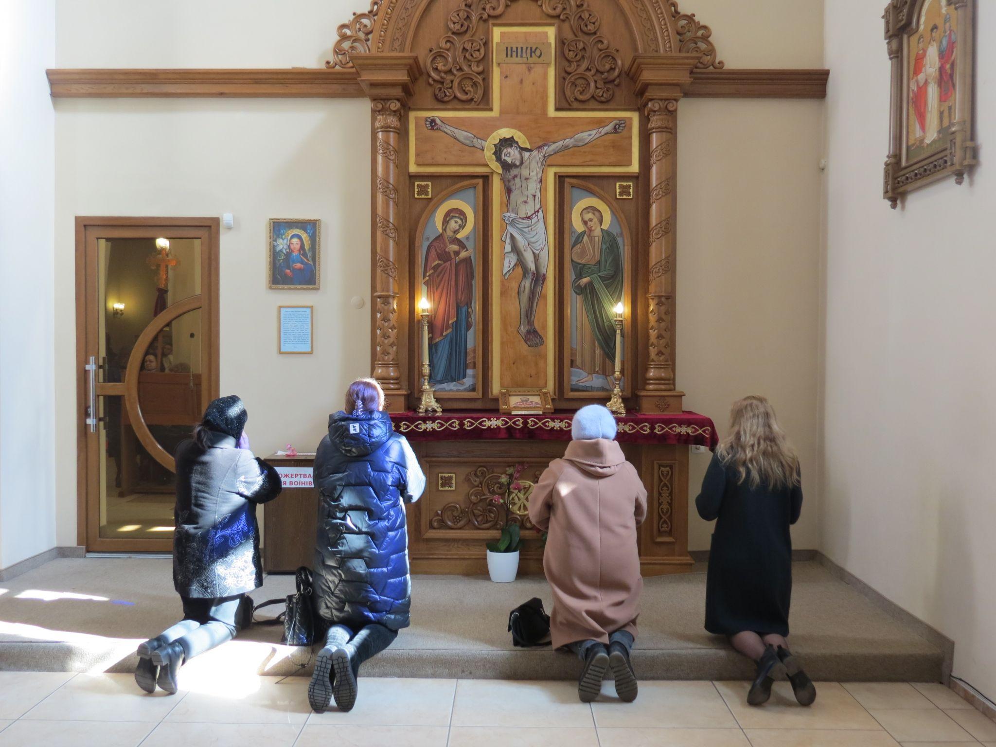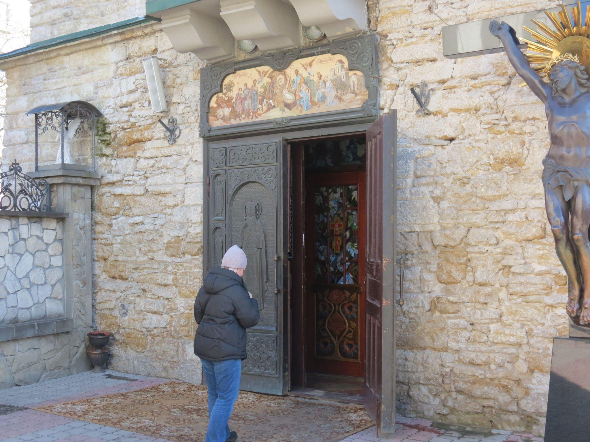 Оскільки храм невеликий, деякі віряни заходили всередину на кілька хвилин, щоб помолитися.