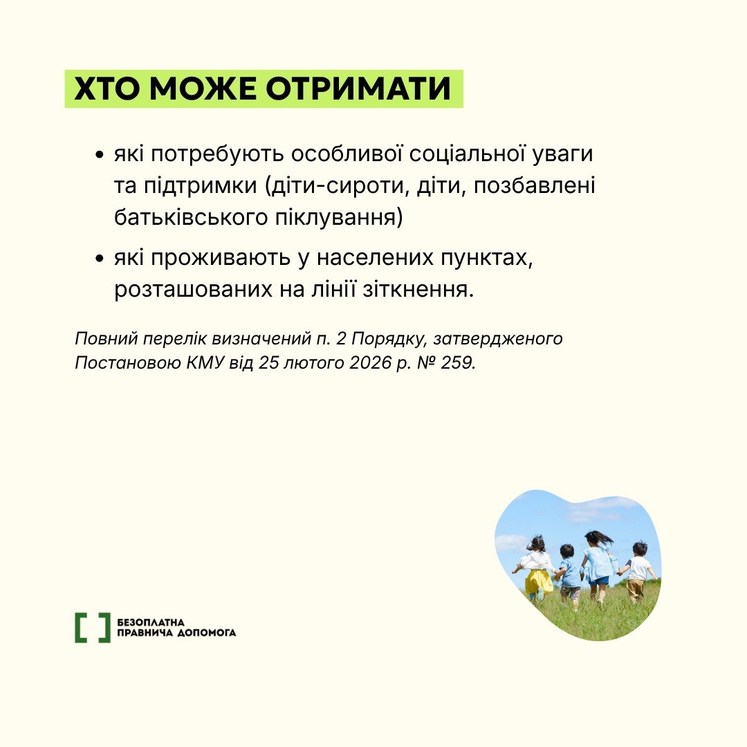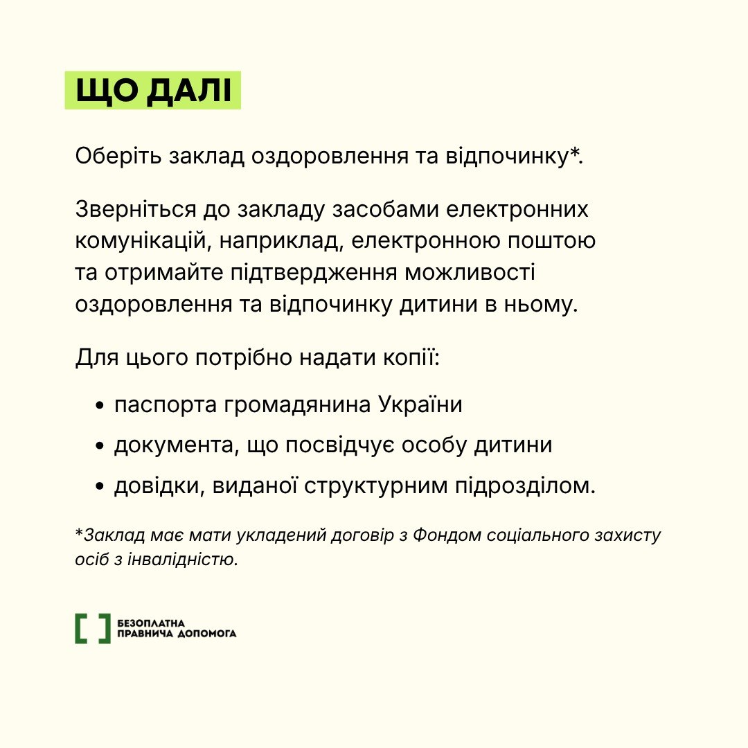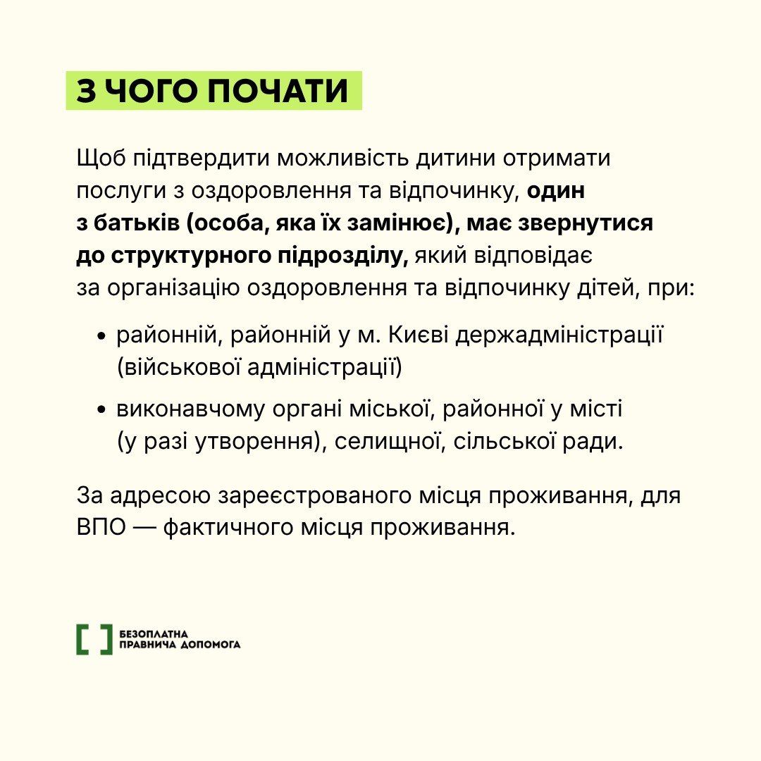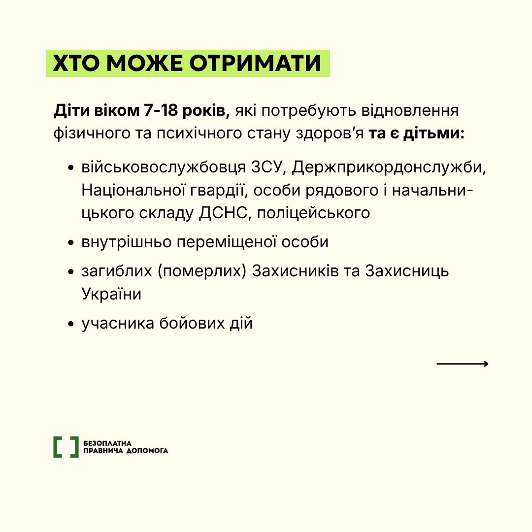 У 2026 році окремі категорії дітей в Україні мають право на безоплатне оздоровлення та відпочинок у визначених закладах. Програмою можуть скористатися, зокрема, діти військовослужбовців, загиблих Захисників і Захисниць, внутрішньо переміщені особи та діти з прифронтових територій, а батьки самостійно обирають заклад із переліку, погодженого державою.