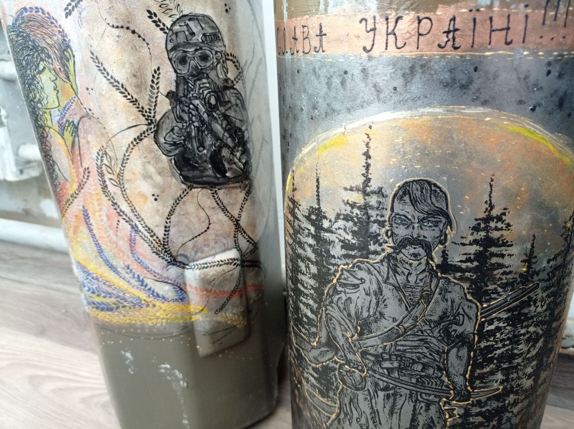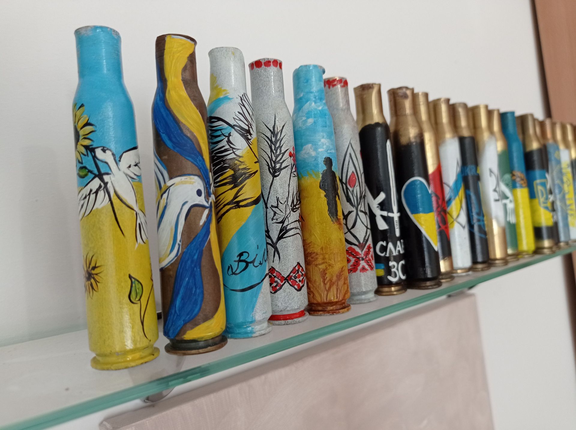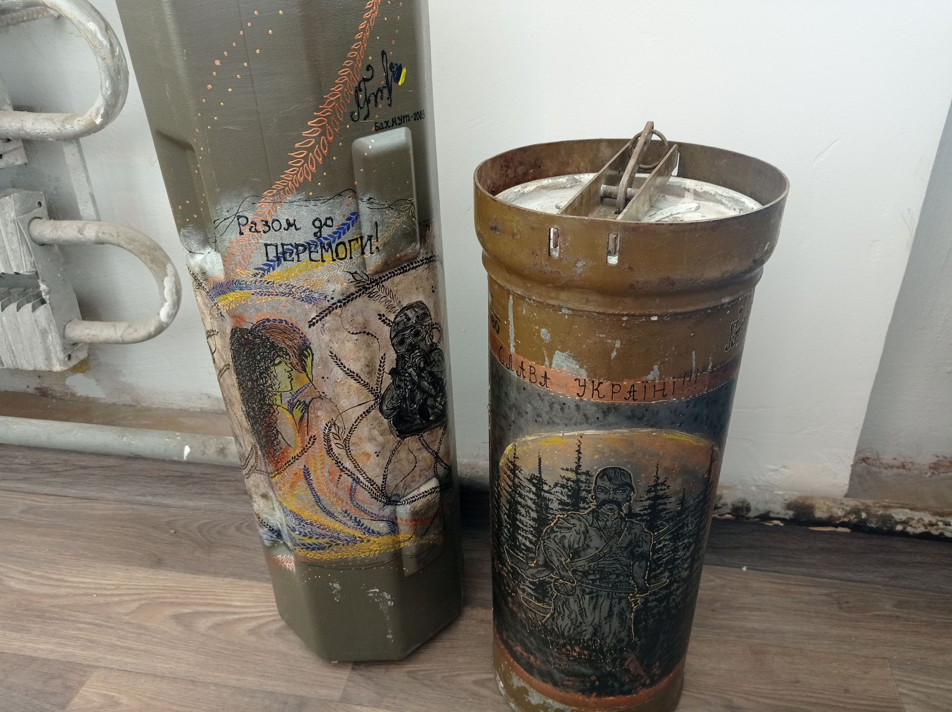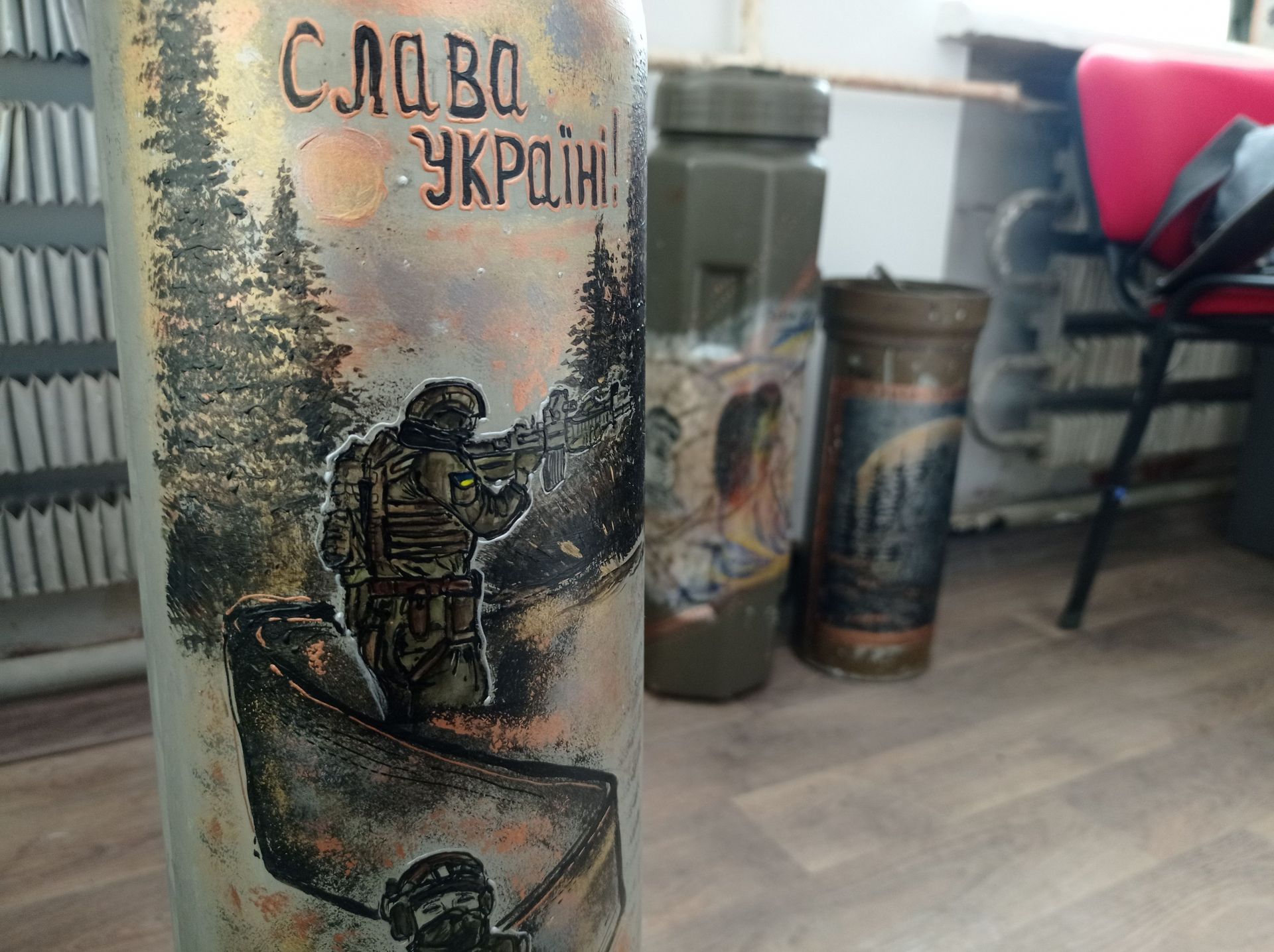 Щоб збирати кошти та техніку волонтери розмальовують гільзи, труби та тубуси від гранатометів, ящики від боєкомплектів, тощо. З цим допомагають місцеві художники, дружини та діти наших бійців.