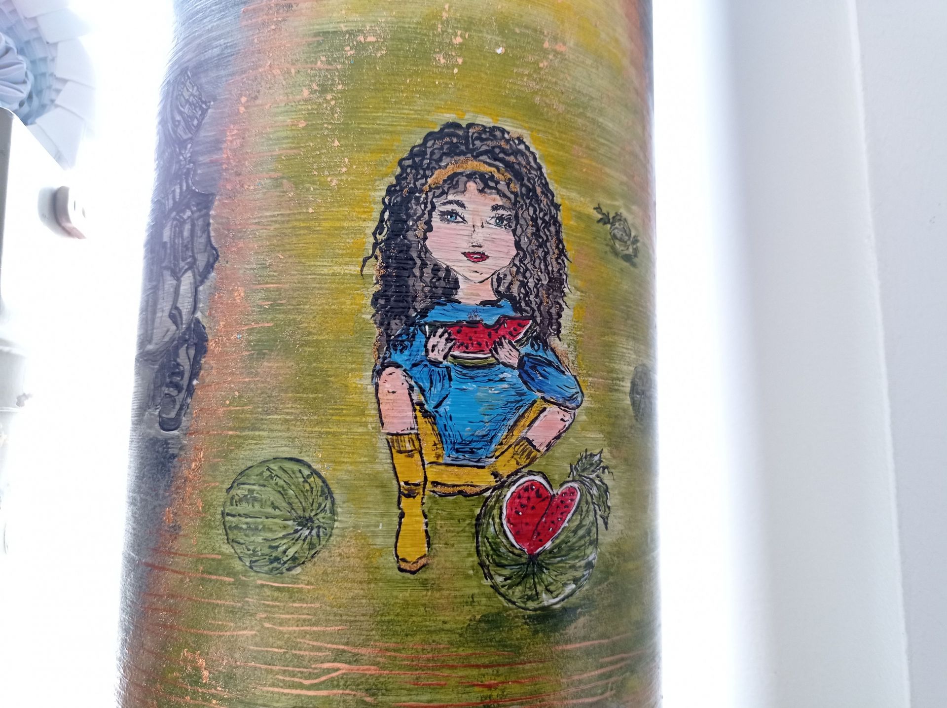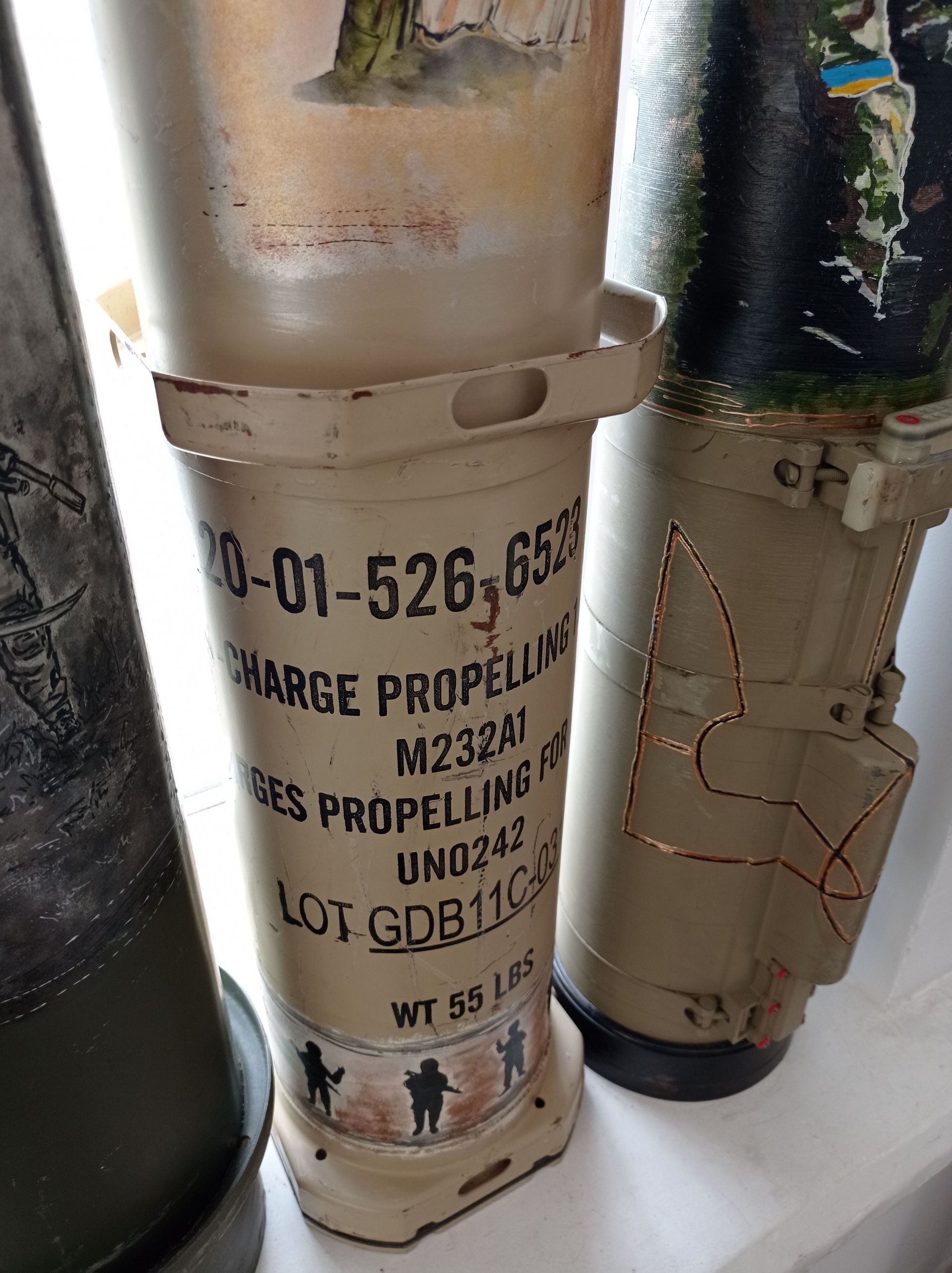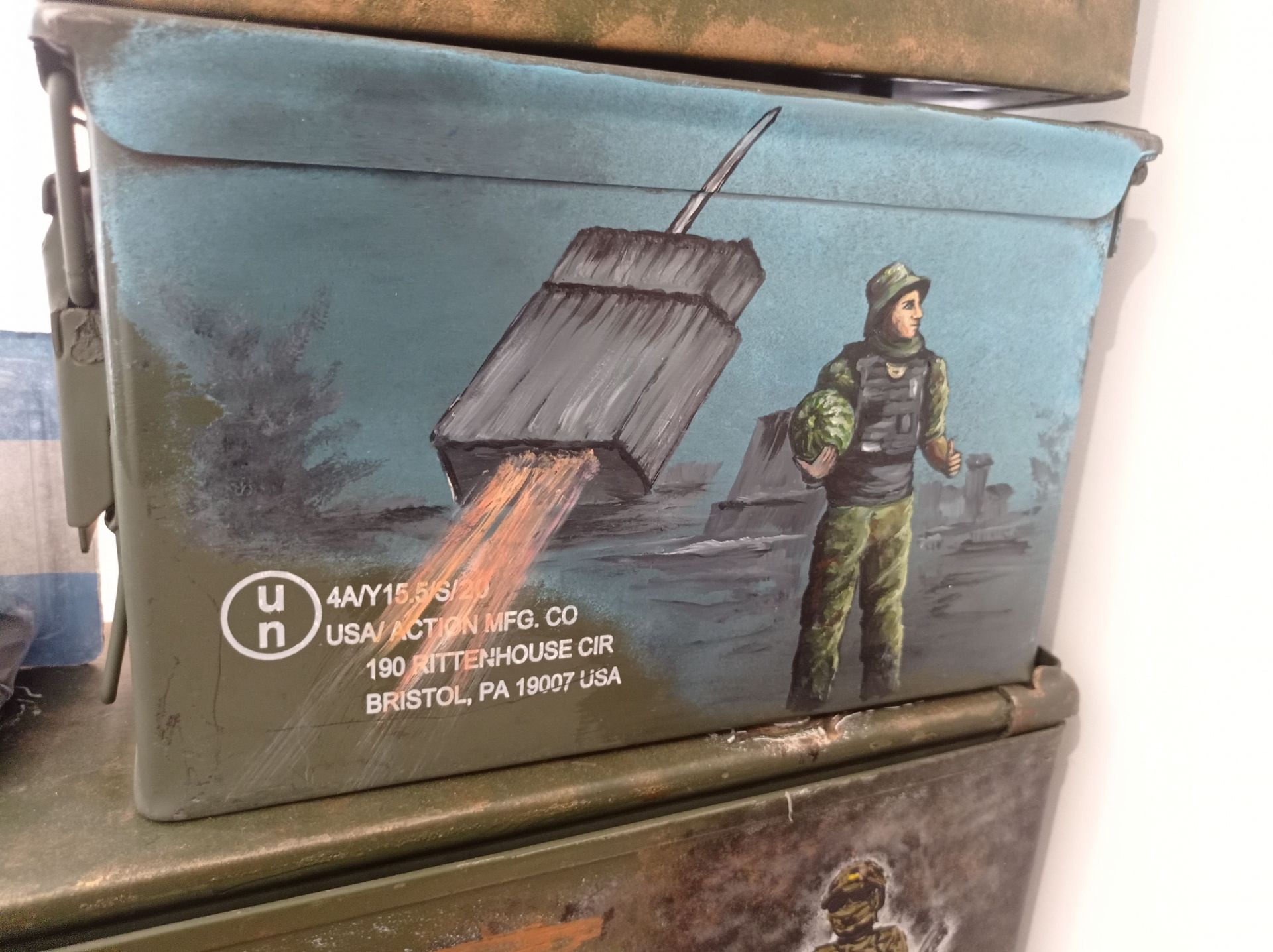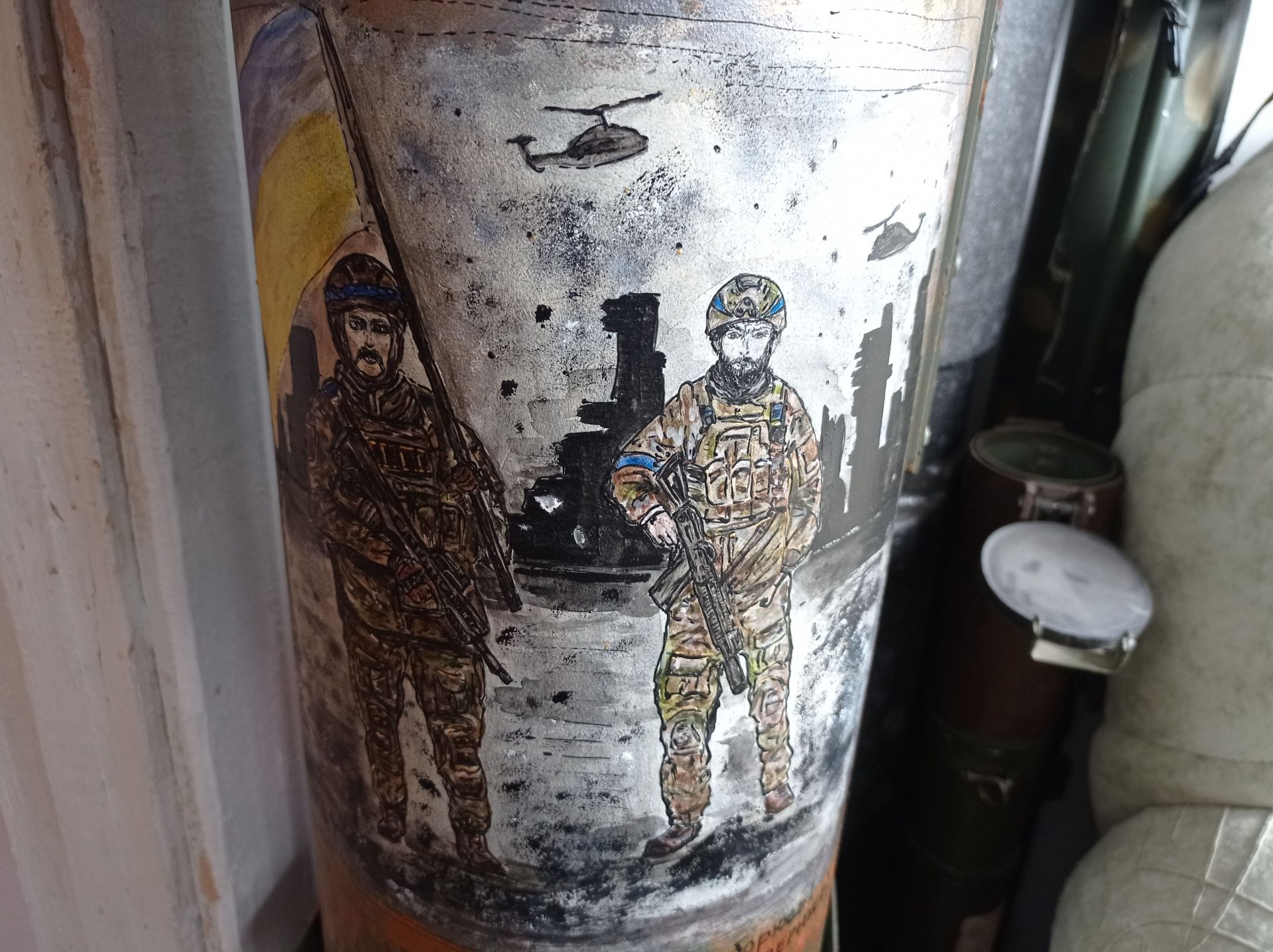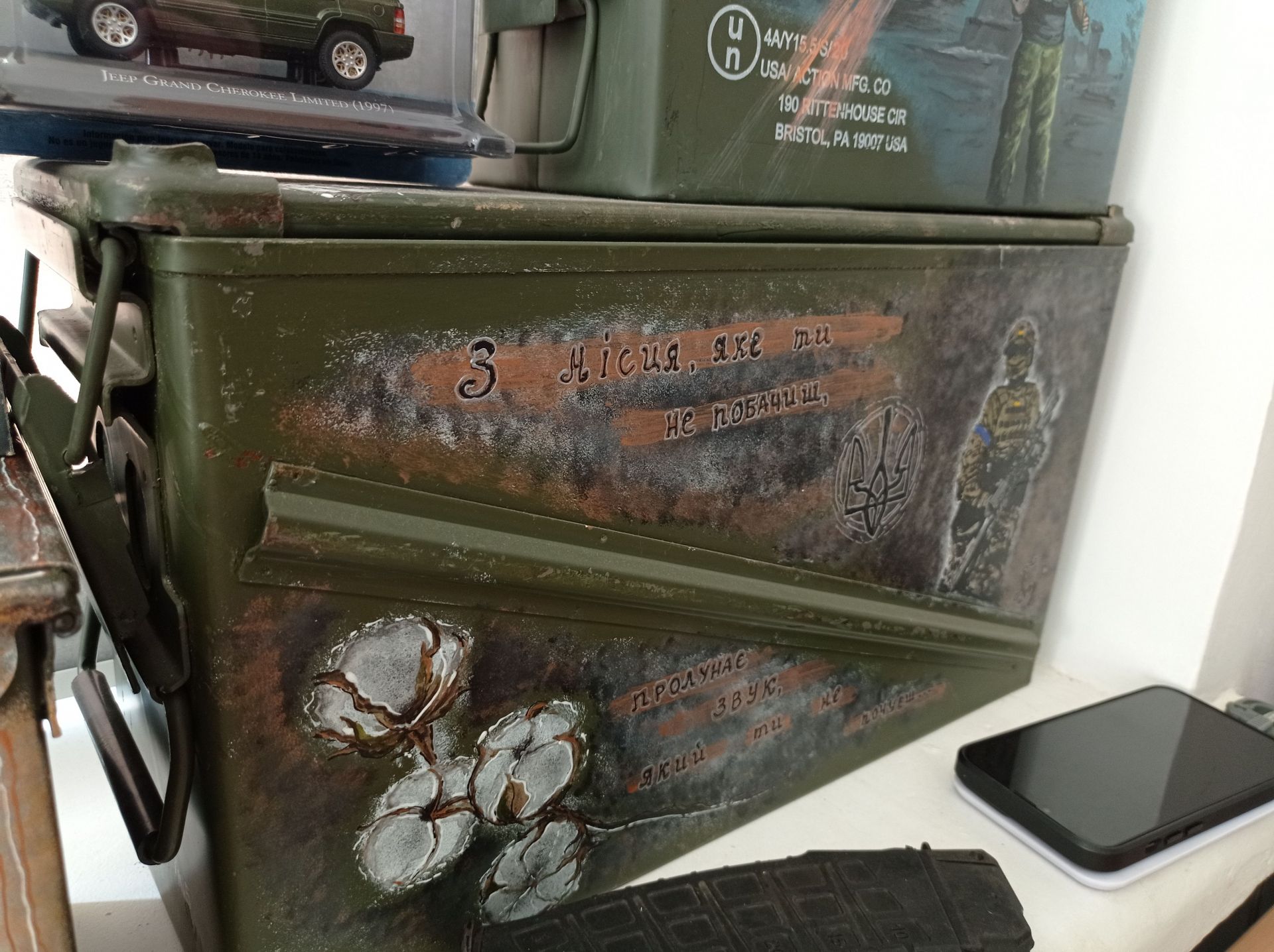 Щоб збирати кошти та техніку волонтери розмальовують гільзи, труби та тубуси від гранатометів, ящики від боєкомплектів, тощо. З цим допомагають місцеві художники, дружини та діти наших бійців.