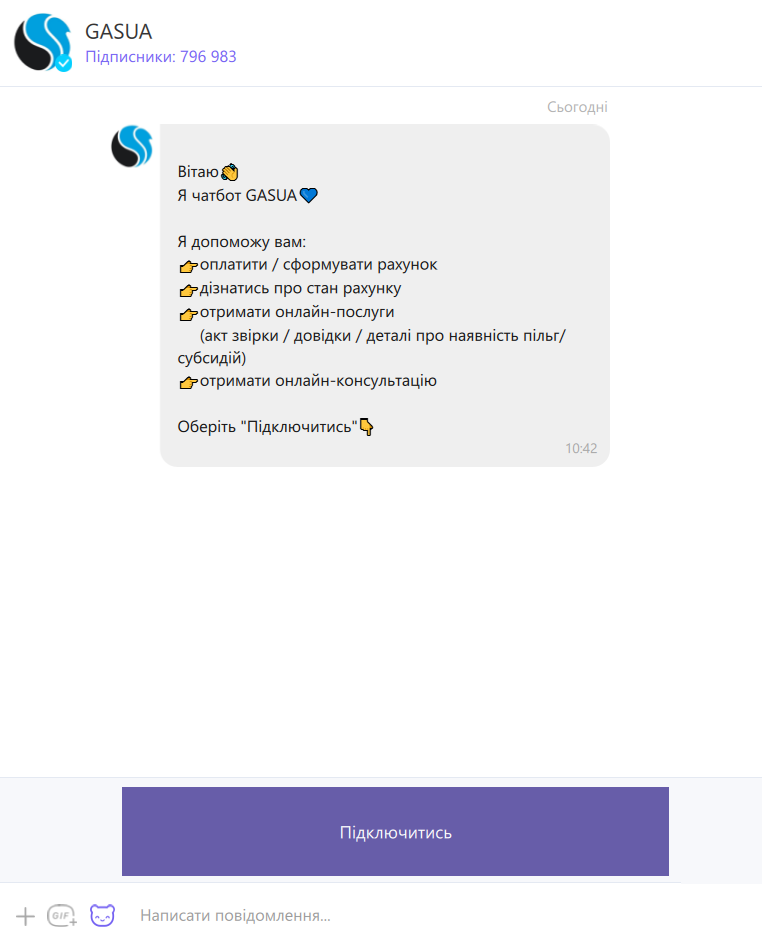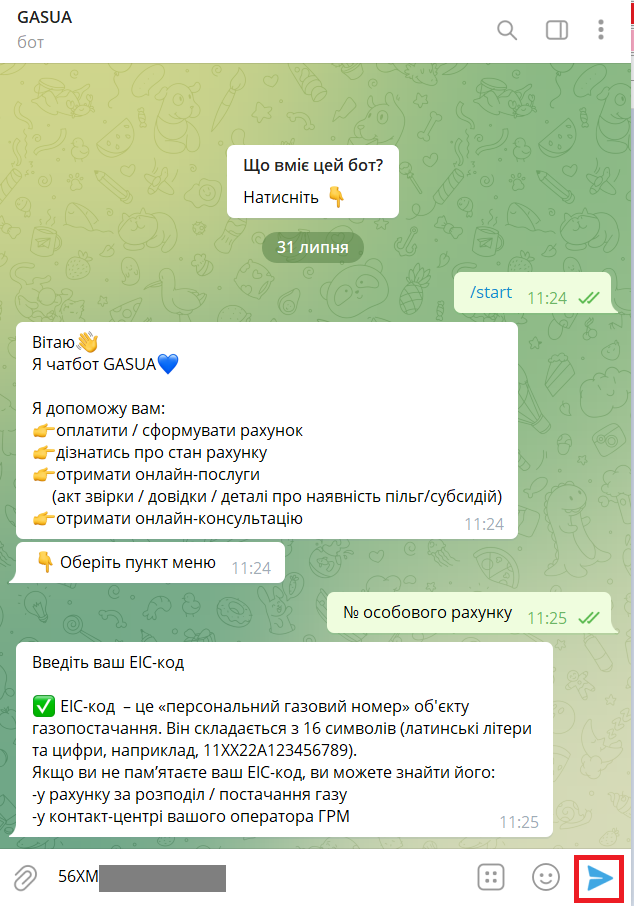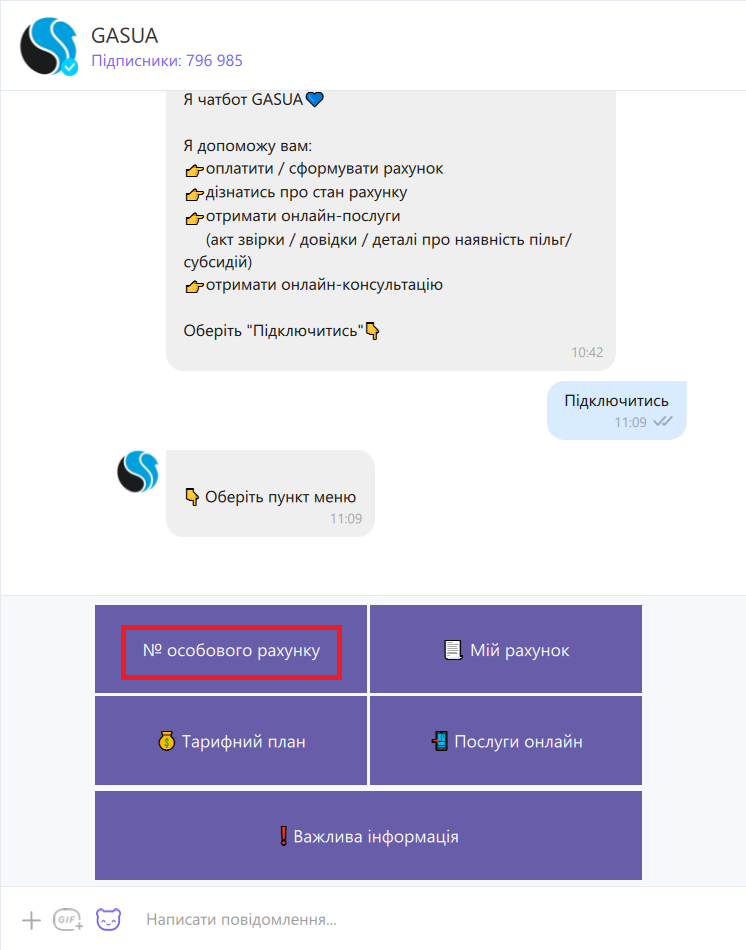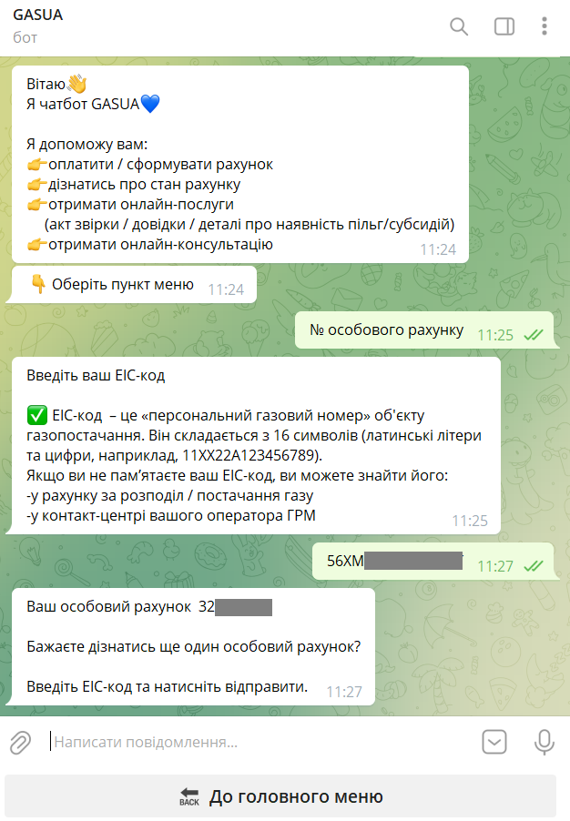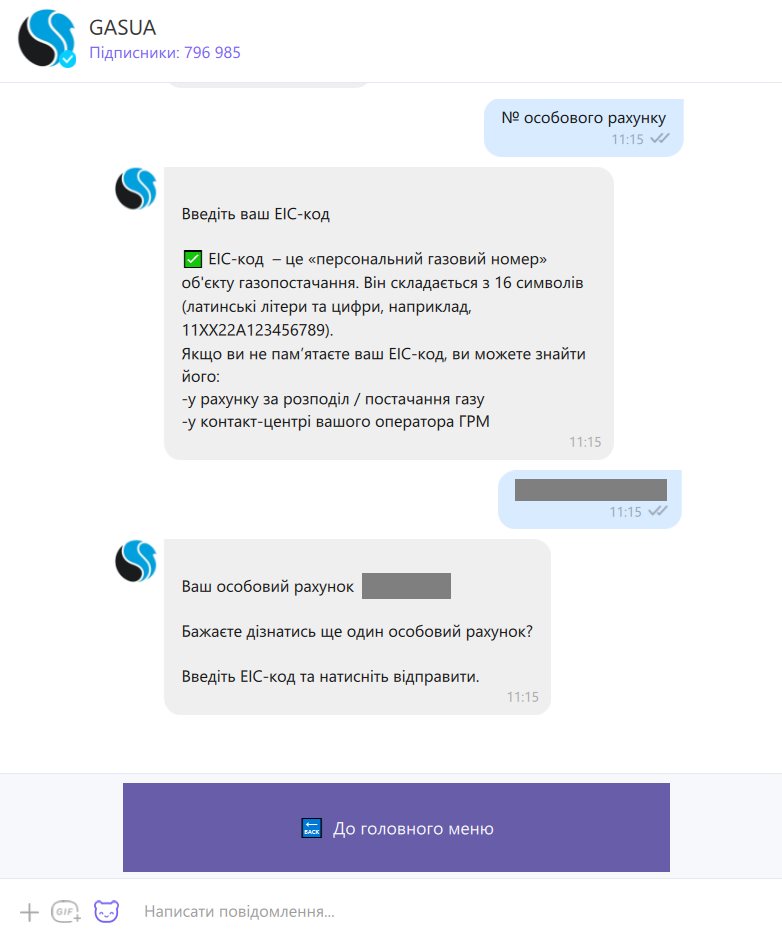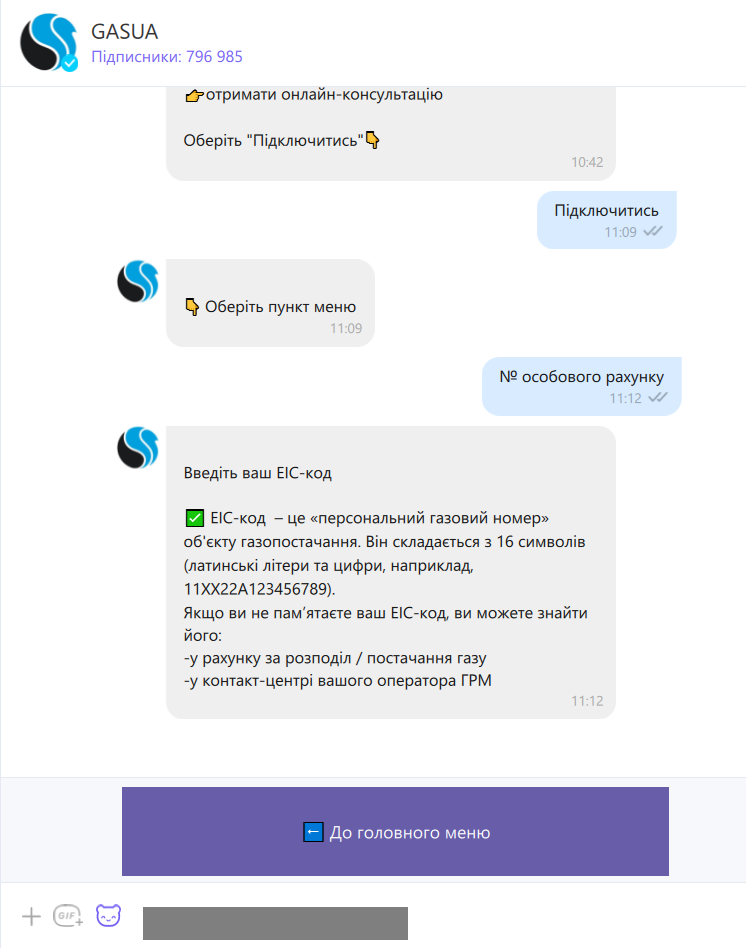Коли ви дізналися ЕІС код – переходимо до одного з чат–ботів «Нафтогазу», де можна дізнатися номер вашого особового рахунку: