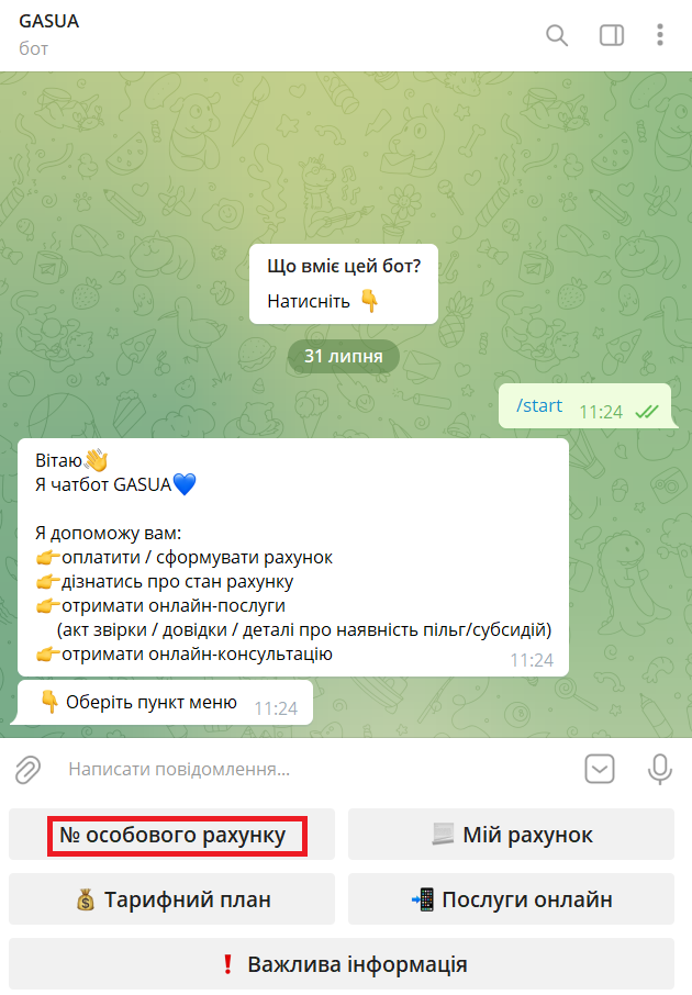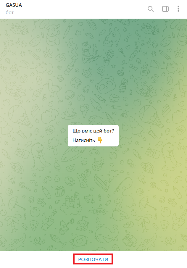 Тепер спробуємо дізнатися номер особового рахунку через месенджер Telegram. Переходимо до бота і тиснемо «Розпочати».