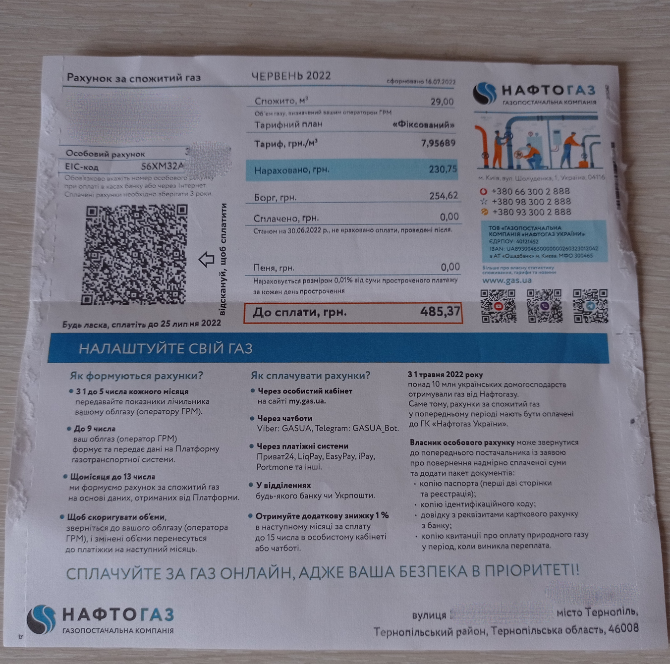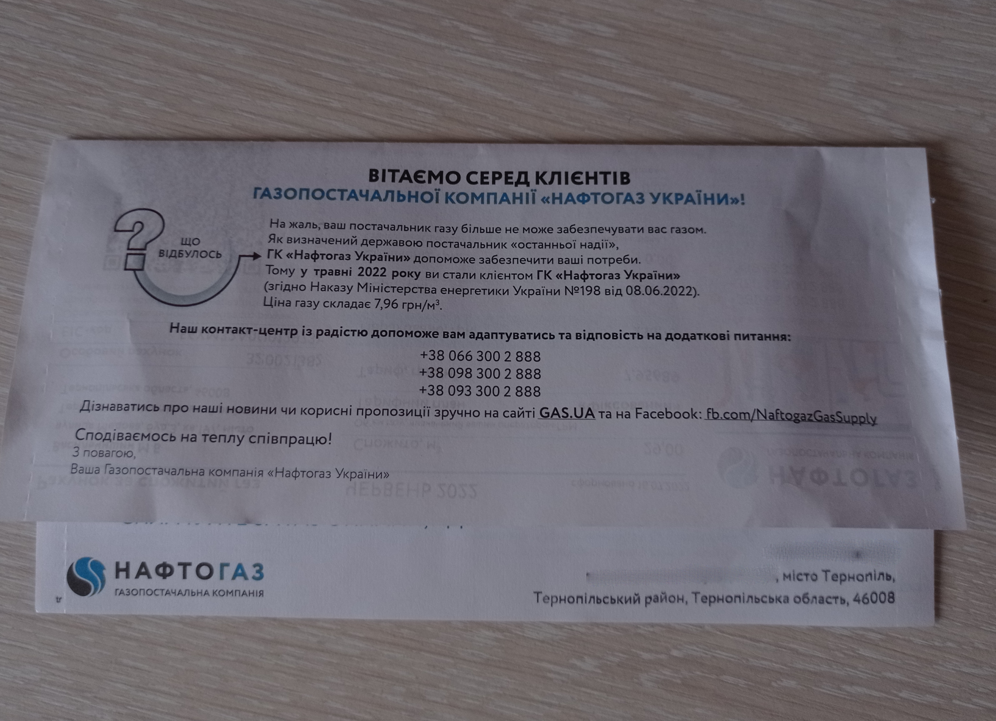 У поштові скриньки місцевих розносять нові рахунки. Крім заборгованості там також вказано повідомлення, що ви стали клієнтом нового постачальника, ваш ЕІС–код та номер особового рахунку та важлива інформація про сплату газу.