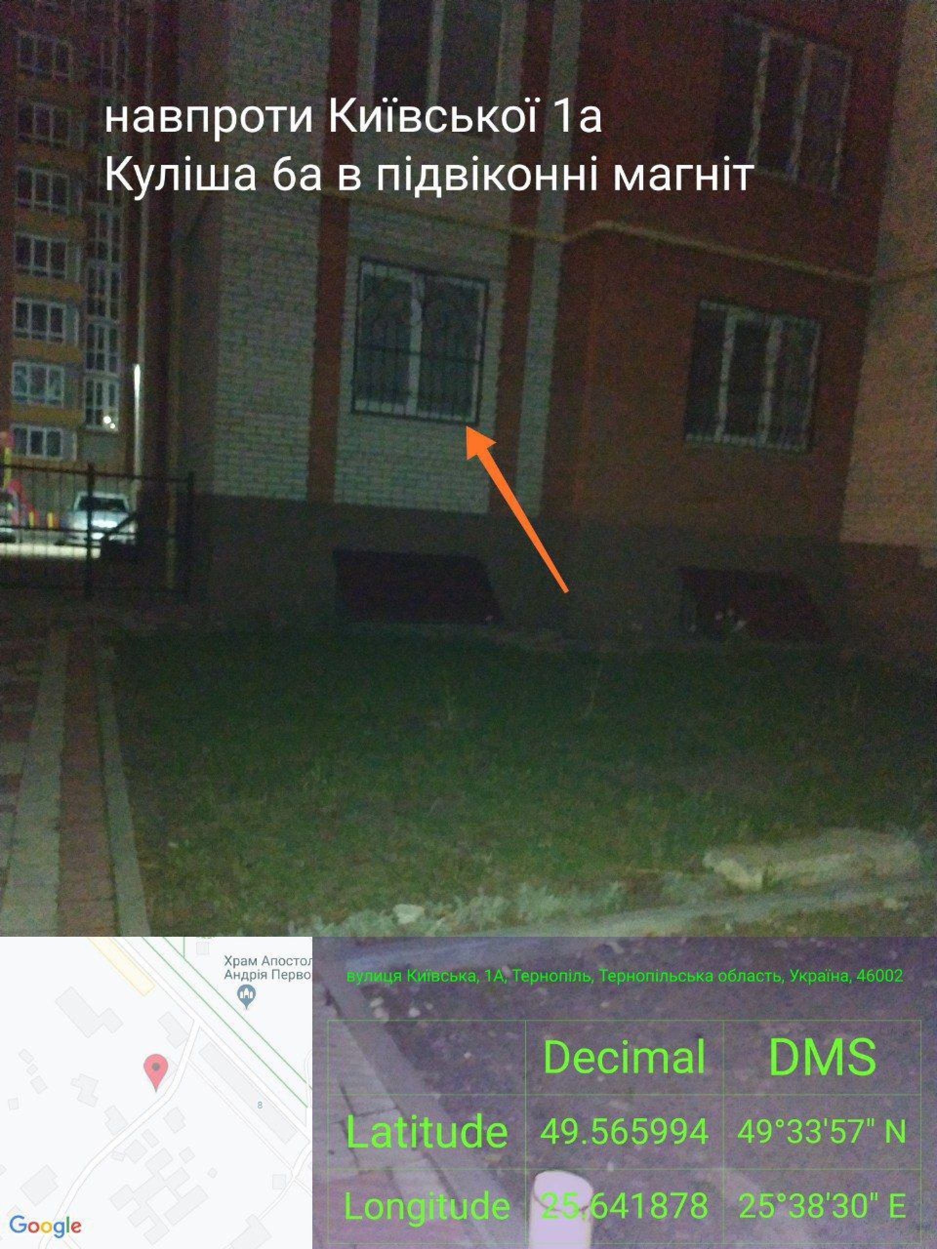 Тепер їдемо на Київську. Там закладка - під підвіконням однієї з квартир. Там нас чекає перша невдача – нічого знайти не вдається. Як вказано на фото – закладка мала бути прикріплена на магніті, однак нічого немає. Складнощі додають і перехожі. Про експеримент журналістів ніхто не знає, і люди підозріло дивляться, що саме роблять невідомі під чужими вікнами та що там так шукають. Однак це місце доводиться лишити, бо на годиннику вже 16:30, і скоро почне темніти. Знайти четверту закладу поміж чагарників та трави в темряві буде важко, тому їдемо за вказаними координатами. На Київську повернемося згодом, а поки шукаємо місце по координатах.