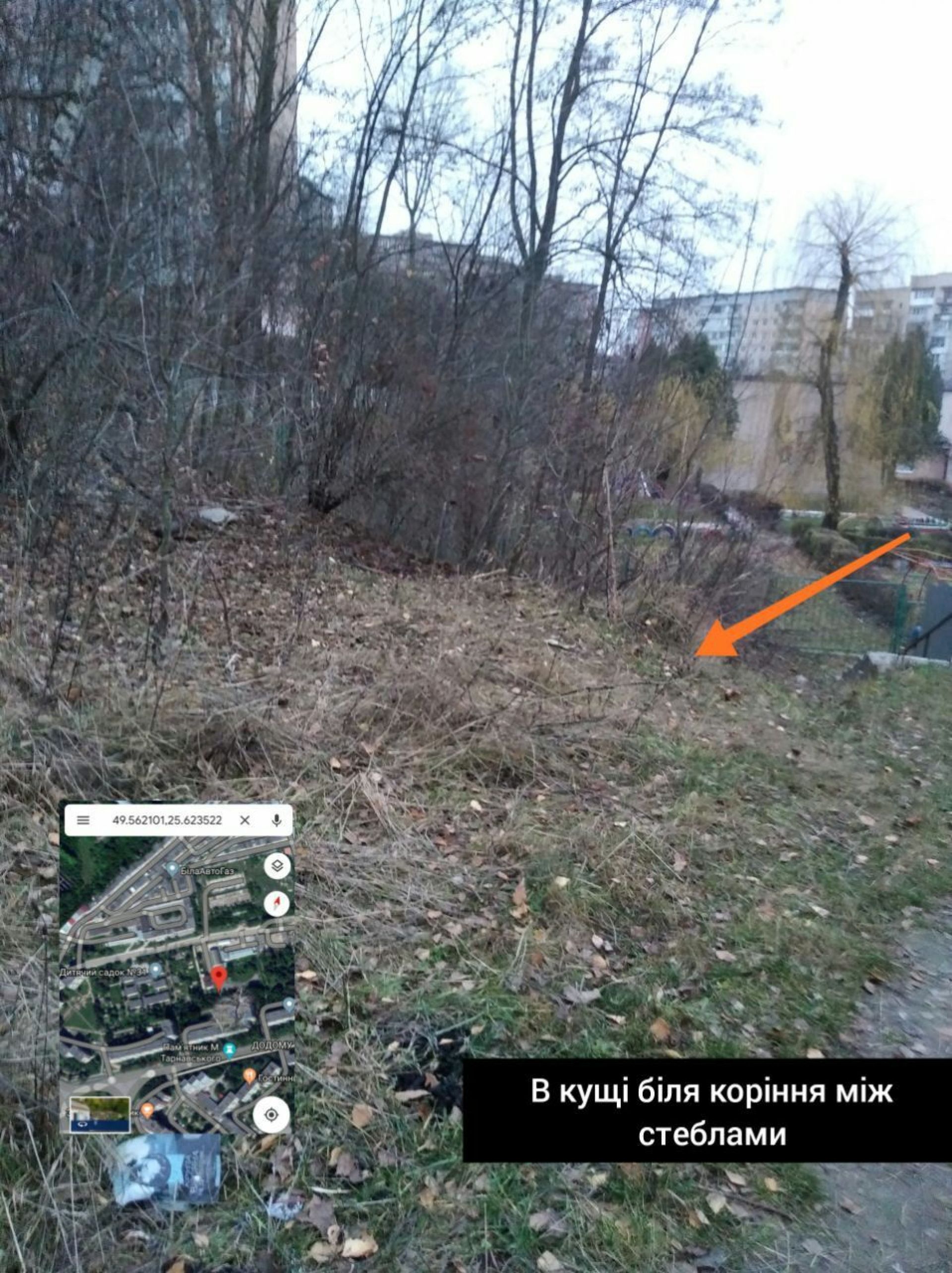 Марихуана має бути на вулиці Тарнавського, неподалік одного з дитячих садків. Знаходимо саме це місце, яке вказано на фото, однак де саме варто шукати – невідомо. До того, ж вже сутеніє. 20 хвилин довелось «перекопувати» все навколо чагарників, які вказані на фото, однак нічого немає. Коли вже вирішуємо лишати це місце – таки знаходимо коричневий згорток. Він серед знайдених є найбільшим. Це третя закладка з чотирьох.