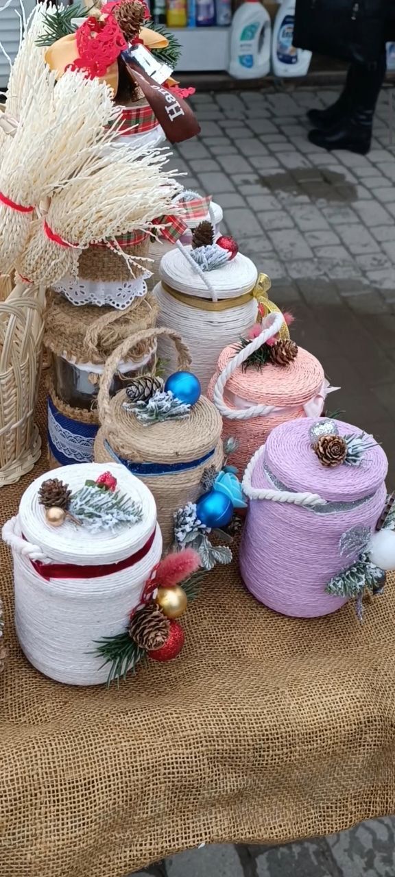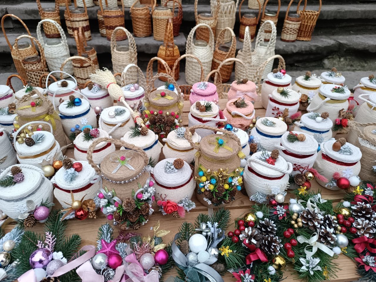 Оздоблені банки у «мішечках» коштують по 250 гривень. Вони прикрашені штучною хвоєю, стрічками та шишками. Ціни у різних продавців не відрізняються.