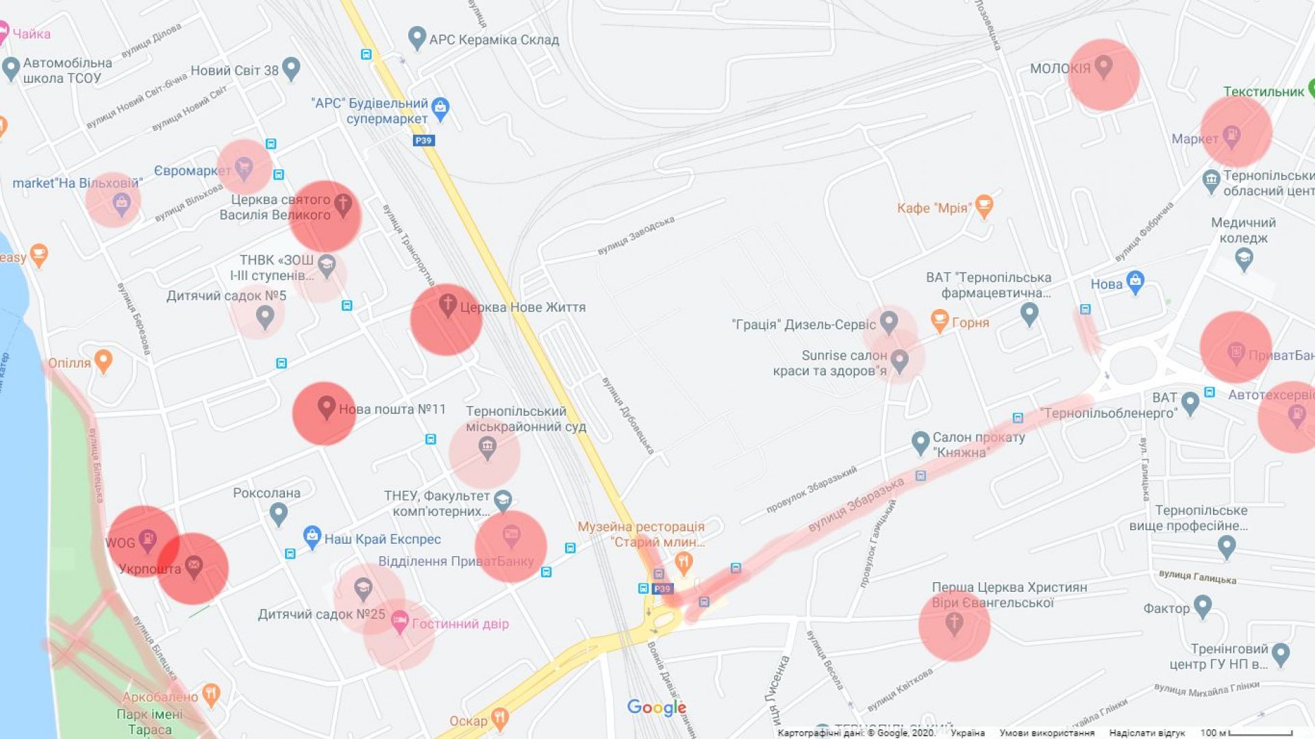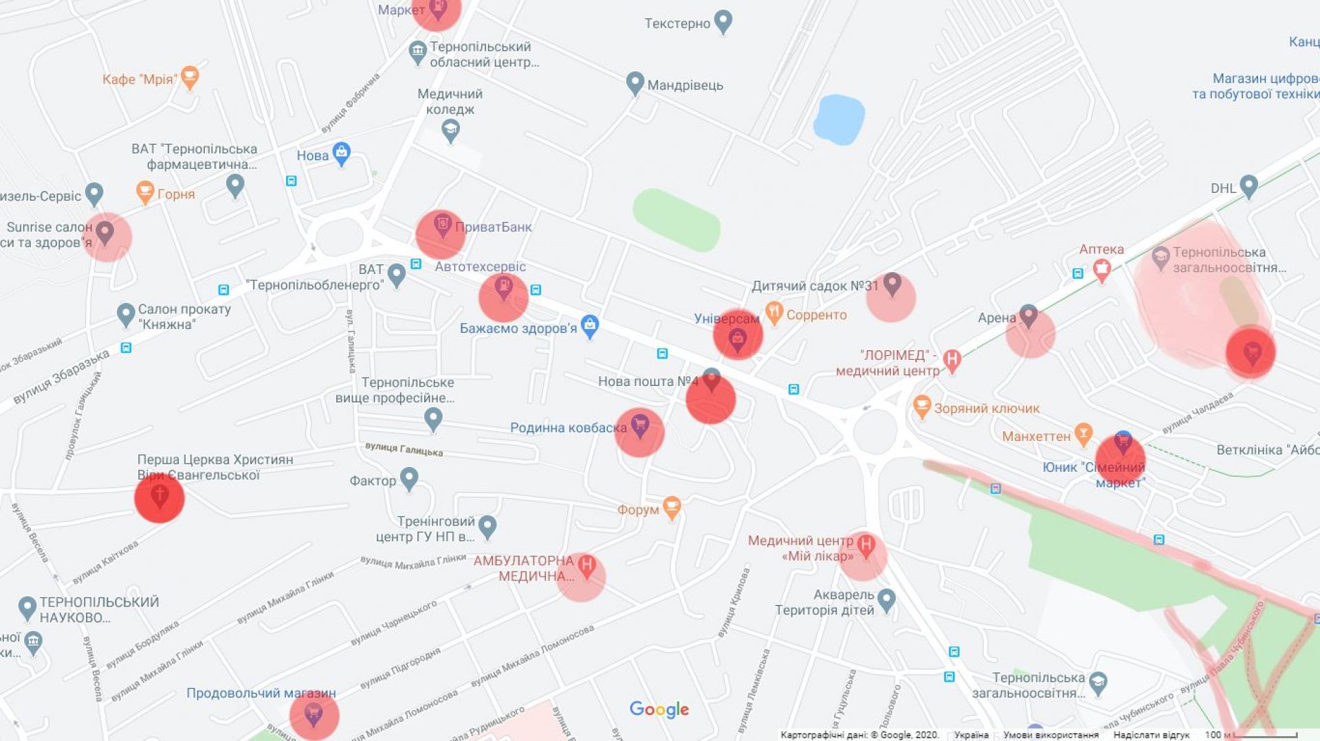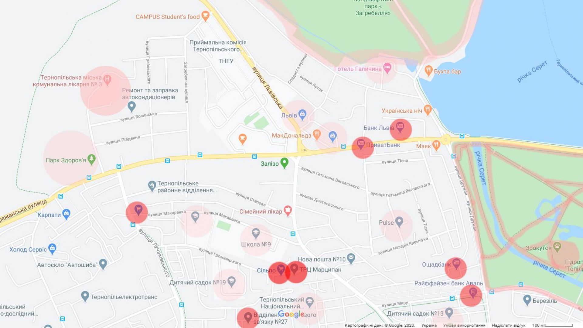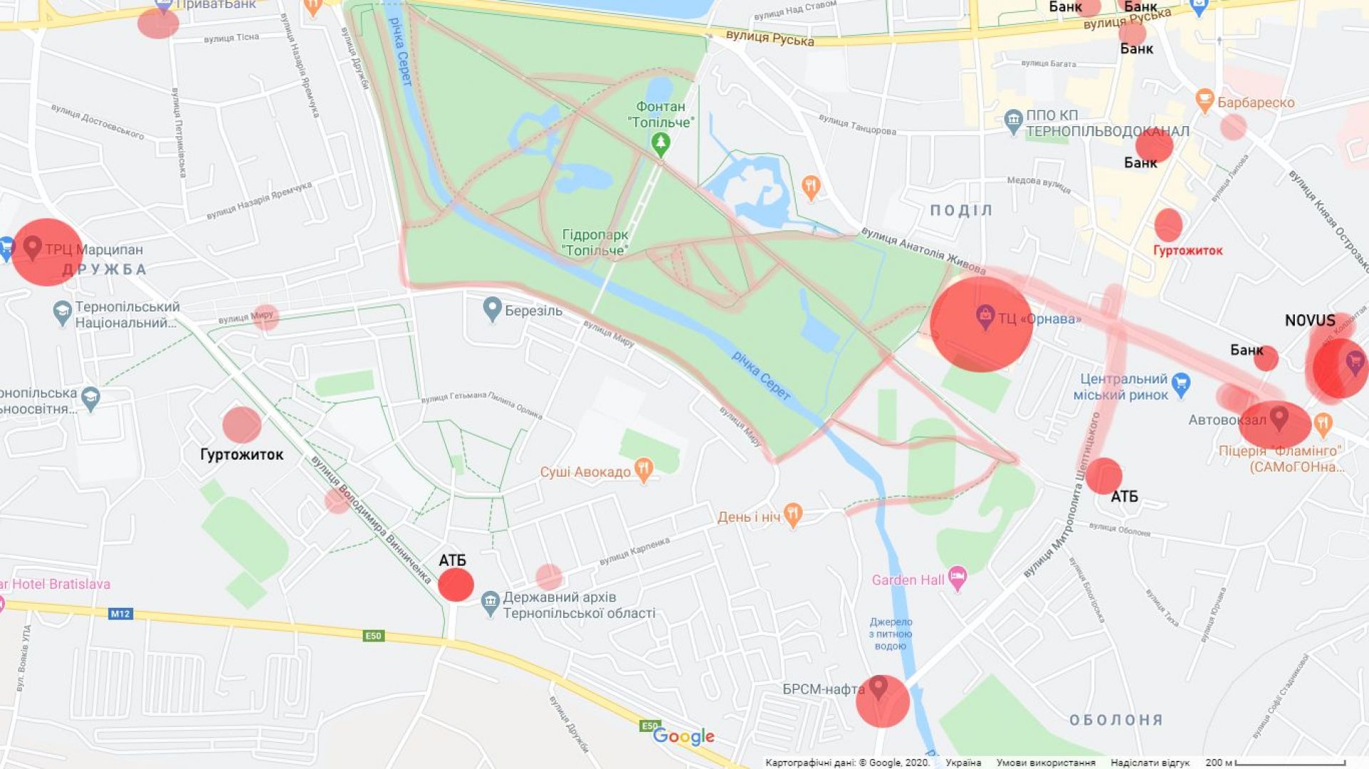 На карті міста ми нанесли найбільш людні місця, які бажано уникати, або ж не відвідувати їх без захисної маски, рукавичок та антисептика.