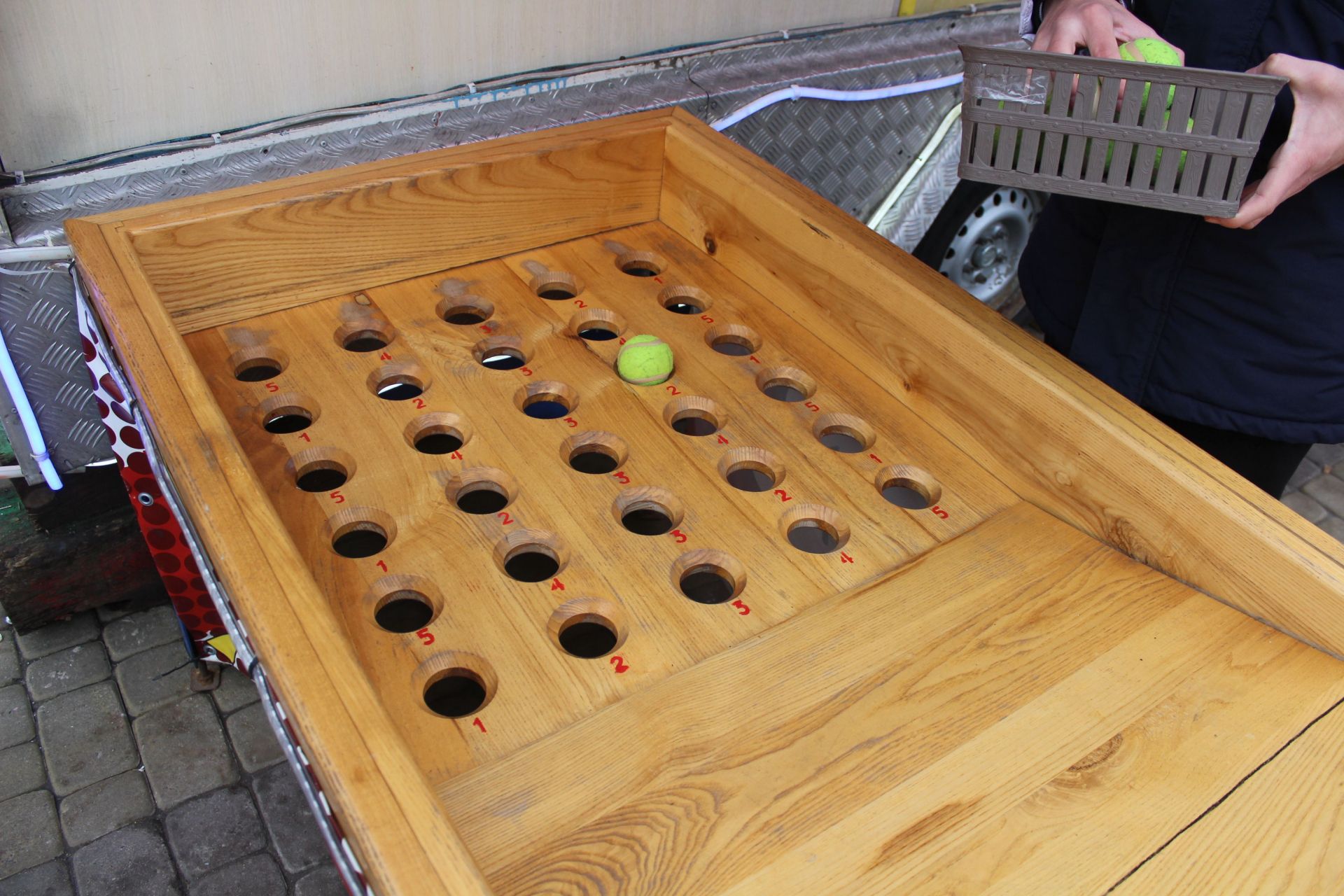 – Вам дається шість м’ячиків, і ви їх закочуєте у спеціальні отвори з позначеної лінії, – розповів касир. – Кожен отвір має суму балів. Якщо м’ячик не закотився – ви повторюєте спробу, доки всі м’ячики не опиняться в отворах. Після цього бали додаються, і ви обираєте собі приз.