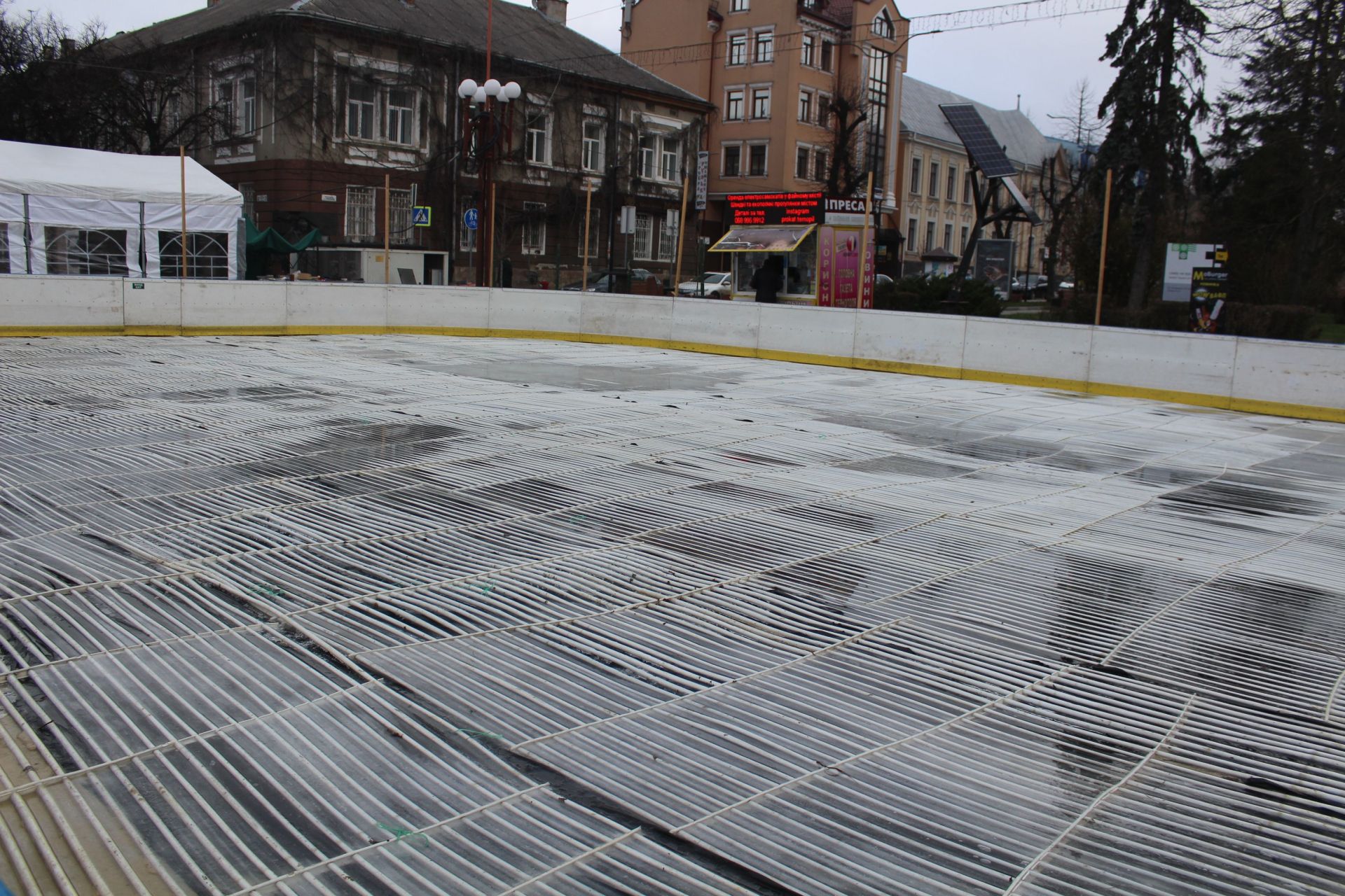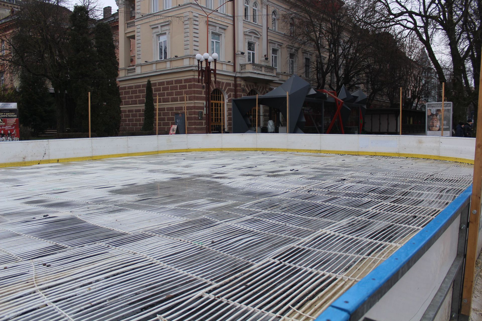 Одна з головних розваг Файного зимового містечка – ковзанка. Вона ще не працює. Її вже облаштували, але потрібно заморозити її.