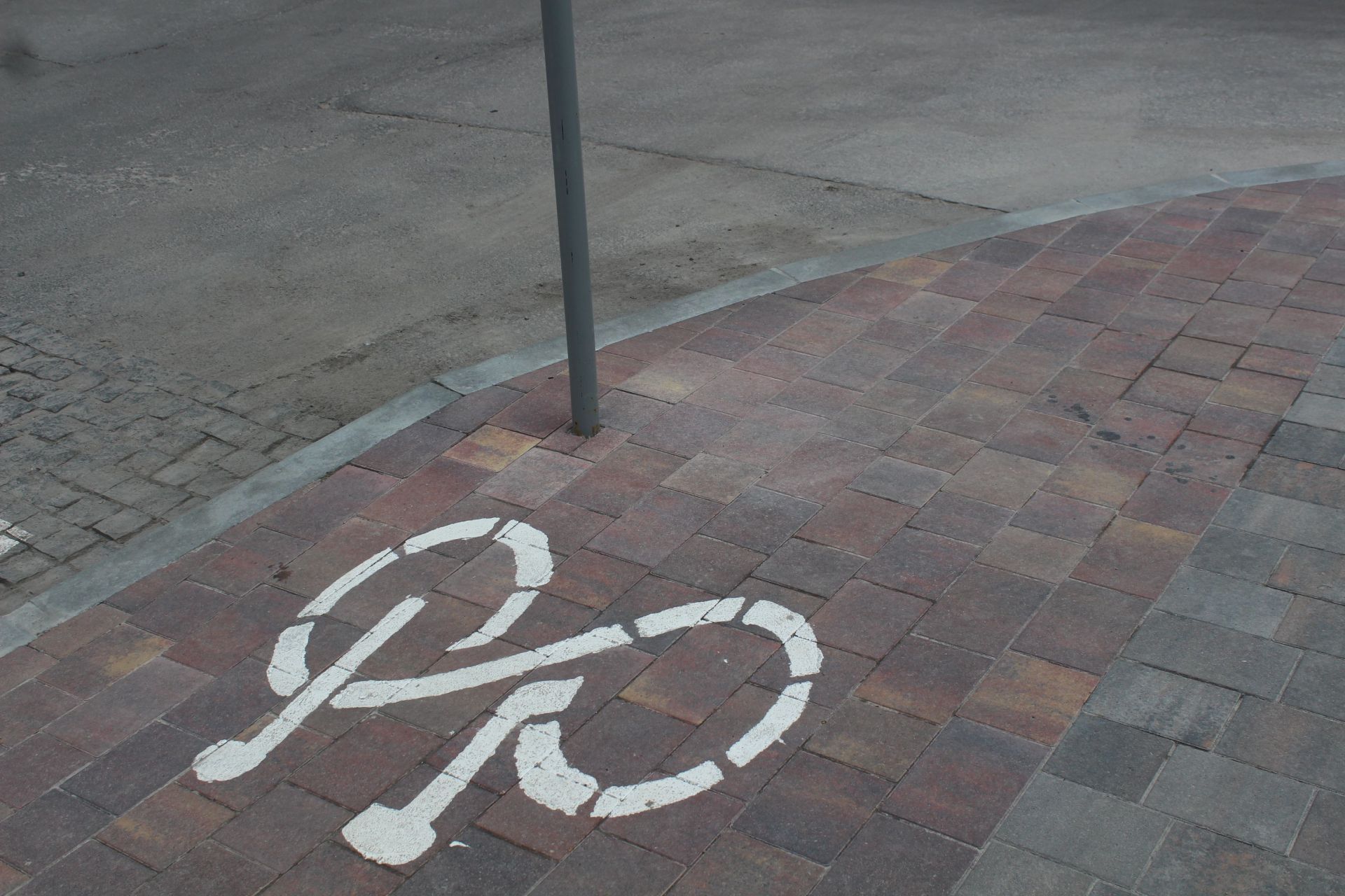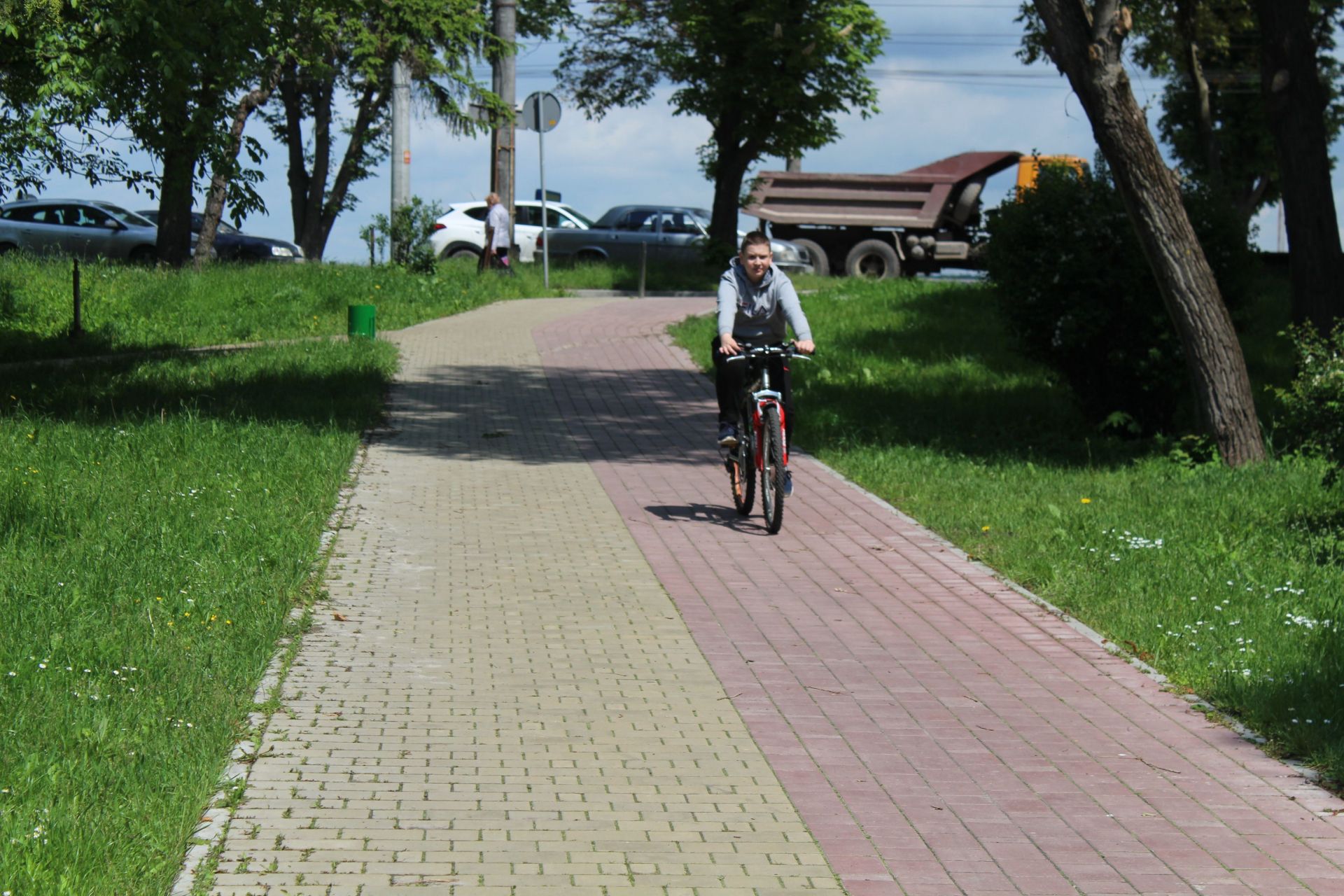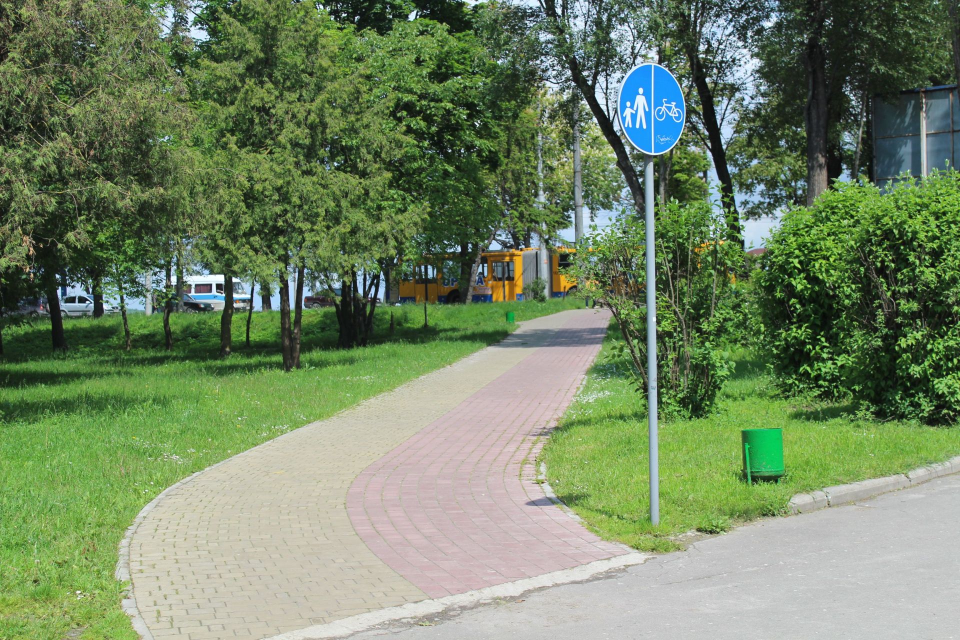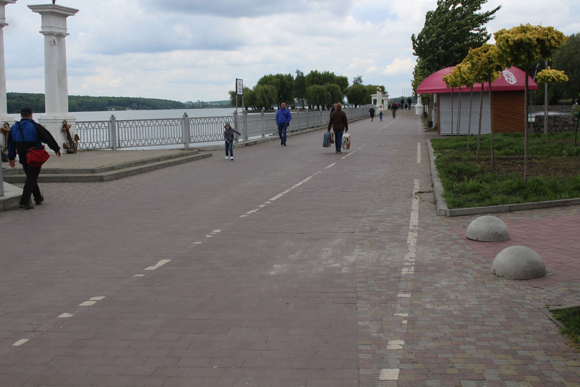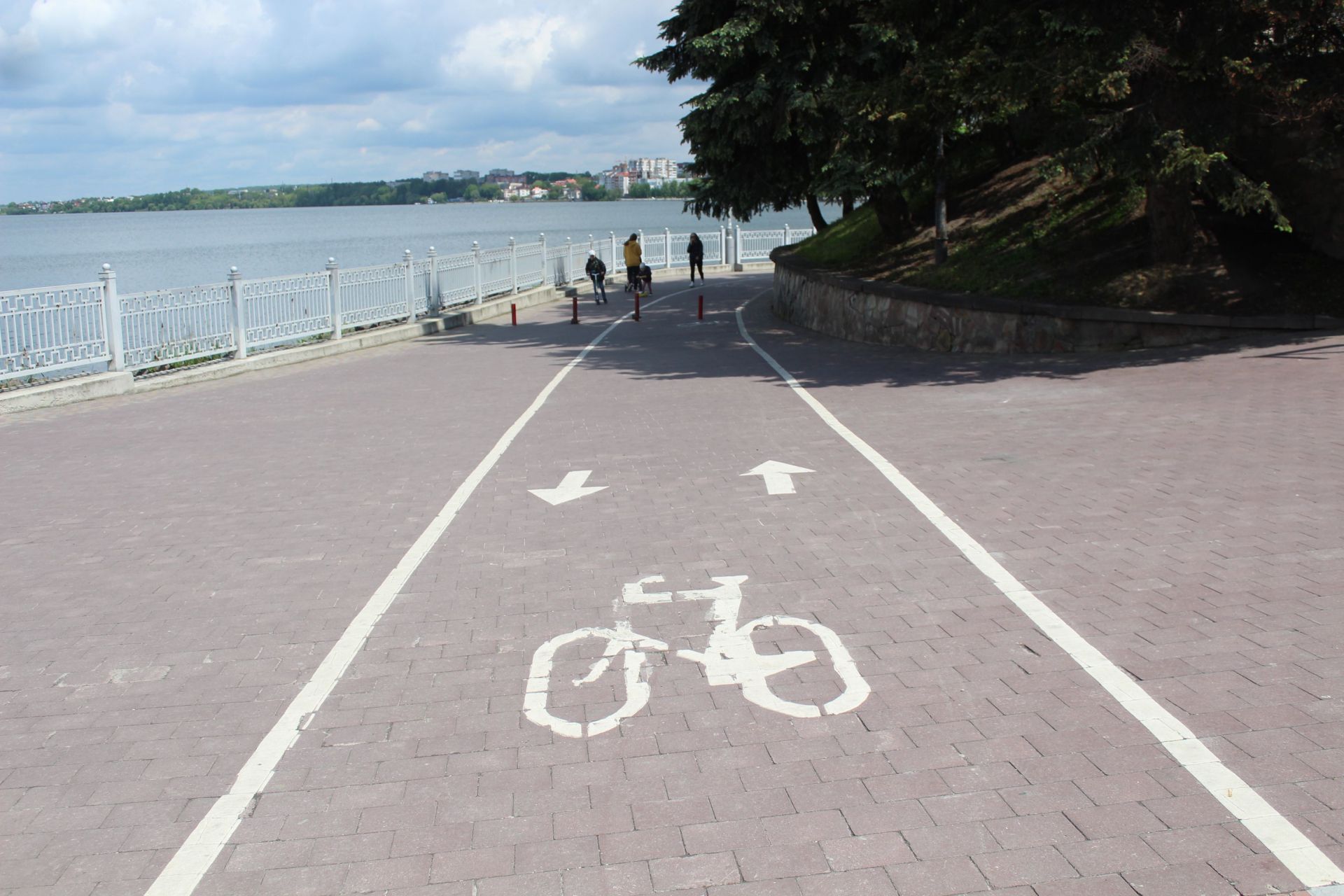 Вздовж набережної є велодоріжка біля «Топільче». Бруківка на ній також іншого кольору, тому її помітно. Є і відповідні знаки. Але перехожі часто забувають, що це велодоріжка і ходять по ній.