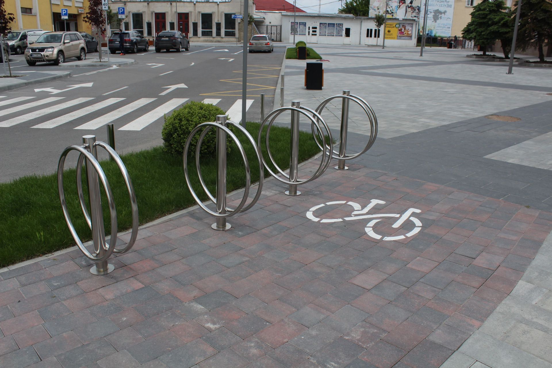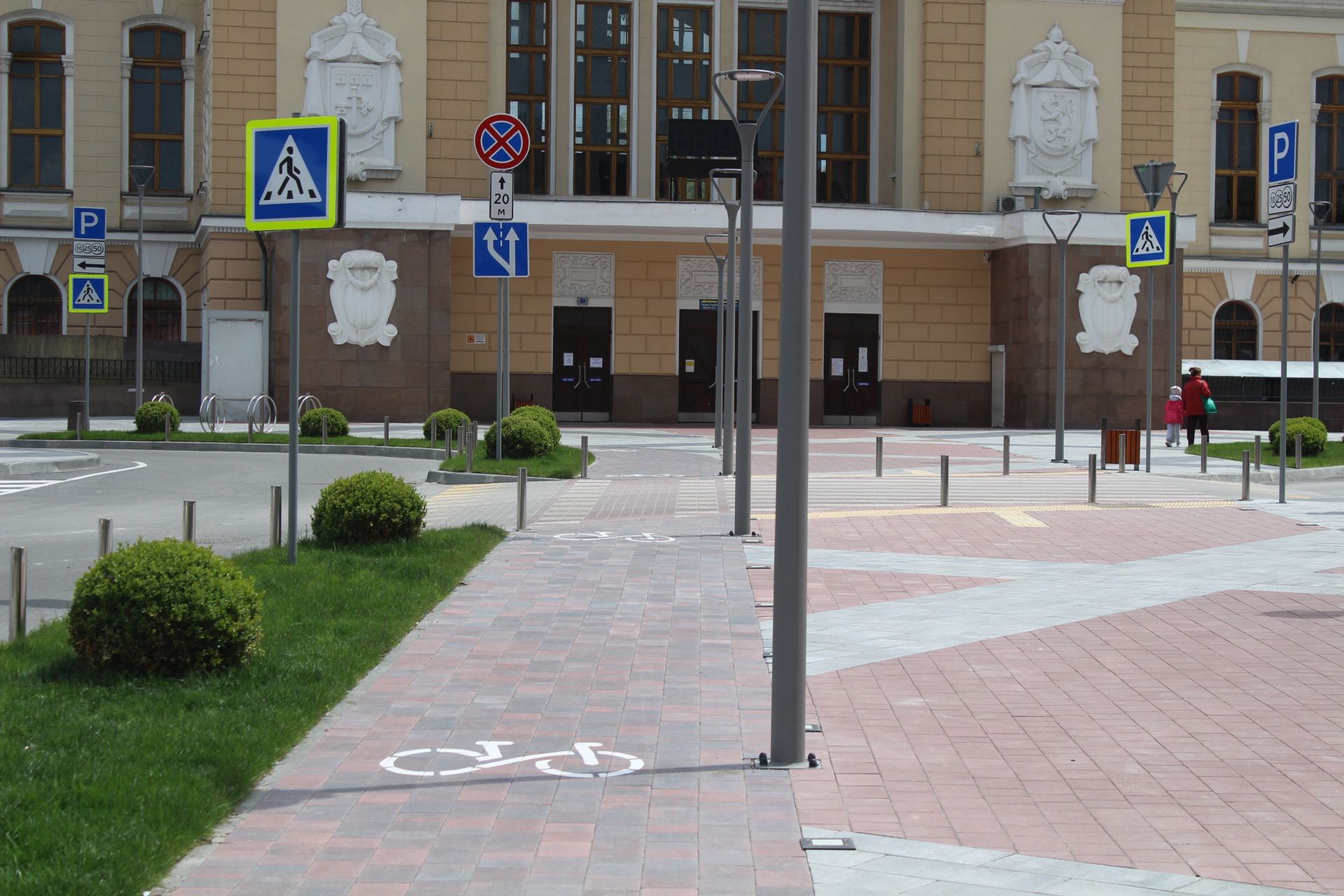 На оновленому Театральному майдані також з’явилась велодоріжка. Вона невелика – починається на вулиці Богдана Хмельницького і закінчується біля входу в приміщення вокзалу велопарковкою.
