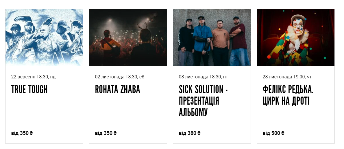 Цієї осені у концерт-холі запланований поки що лише один виступ. 04 жовтня туди завітає гурт АНТИТІЛА. Початок концерту о 19:00. Вартість квитків – 750 гривень.
