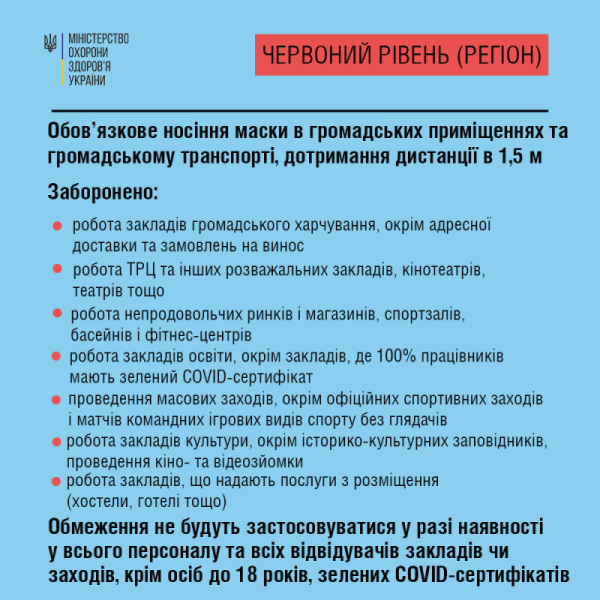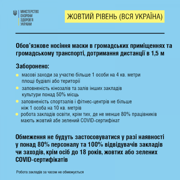 Відвідування закладів освіти здобувачами освіти буде дозволено за умови наявності не менше як у 80% працівників закладу освіти документа, що підтверджує отримання повного курсу вакцинації, чи міжнародного, внутрішнього або іноземного сертифіката. Сертифікат може підтверджувати: