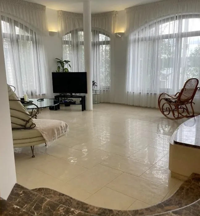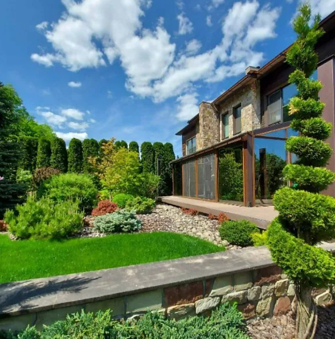 Будинок з рекреаційними спорудами та ландшафтним садом. Загальна площа будинку: 290 метрів квадратних. Є гараж, робоча кухня з виходом у сад, господарське приміщення, котельня, підвал. Вартість у гривнях: 18 914 000 грн.