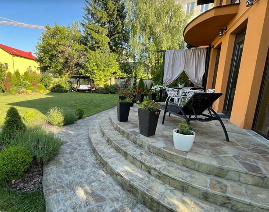 Будинок неподалік від центру Тернополя. Зовні утеплений мінватою і оздоблений декоративною штукатуркою. Задній двір так і уся ділянка оздоблені дизайнерським ландшафтом, альпійськими гірками. Газон з системою автоматичного поливу. На подвір'ї є альтанка. Будинок коштує 21 616 000 грн.