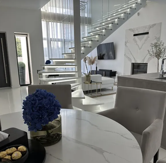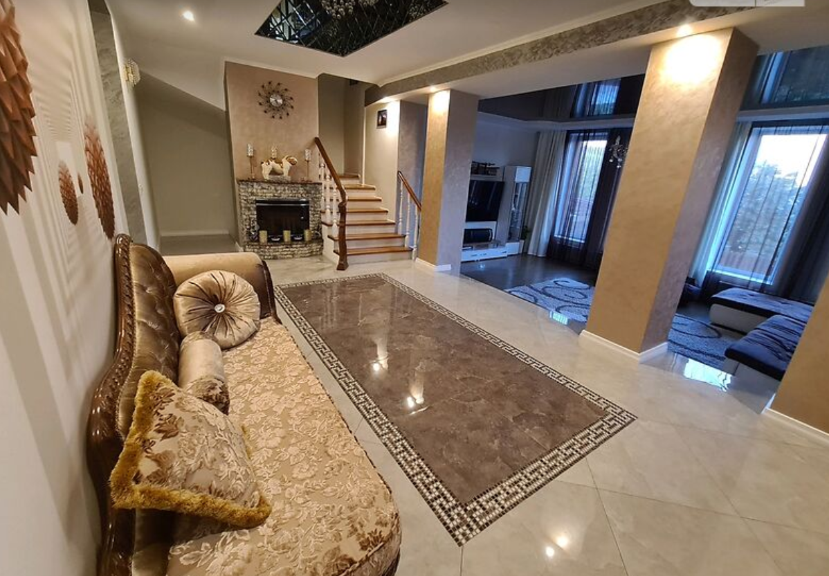 Це будинок площею 328 метрів квадратних. Продавець зазначає, що у будинку є 6 кімнат, 3 спальні, гардеробна, спортзал, облаштовані 2 місця для зарядки електромобіля, електрогенератор для аварійного живлення, стабілізатори напруги, 4 кондиціонери, новорічна підсвітка будинка, автоматичний полив газона, газове опалення. Є сигналізація, відеоспостереження, система антизатоплення та антизадимлення. Будинок коштує понад 15 млн гривень у гривнях.