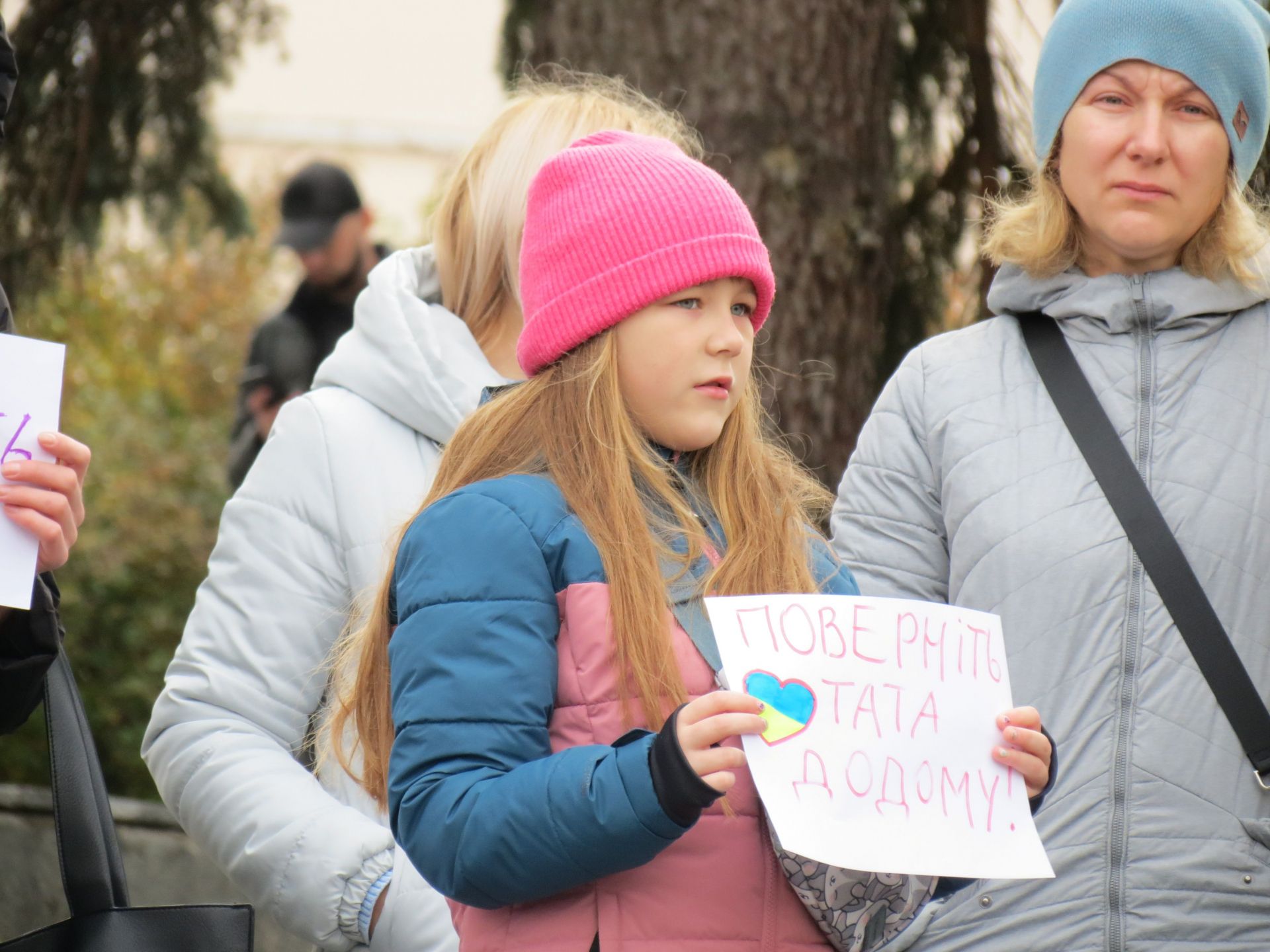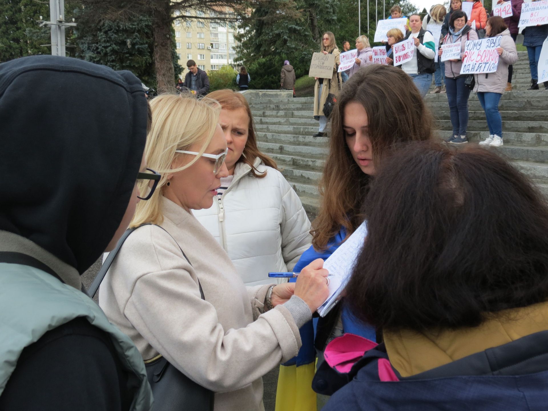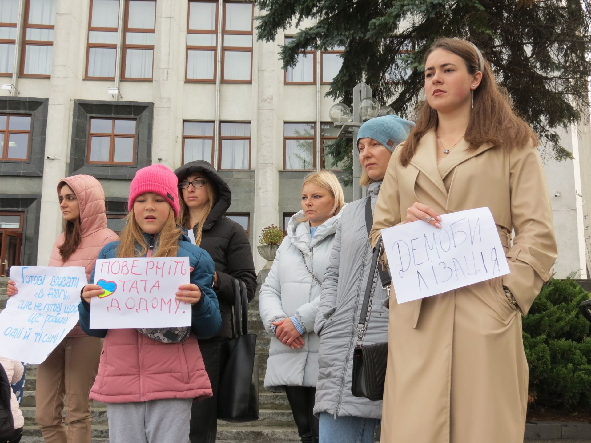 Перед Тернопільською обласною військовою адміністрацією вранці, 27 жовтня, організували пікет. Зібрались дружини, матері та діти військовослужбовців, які воюють на фронті уже другий рік.