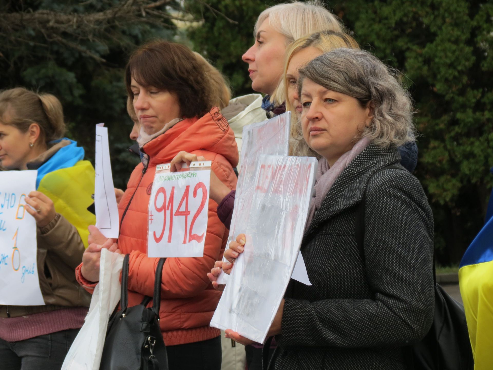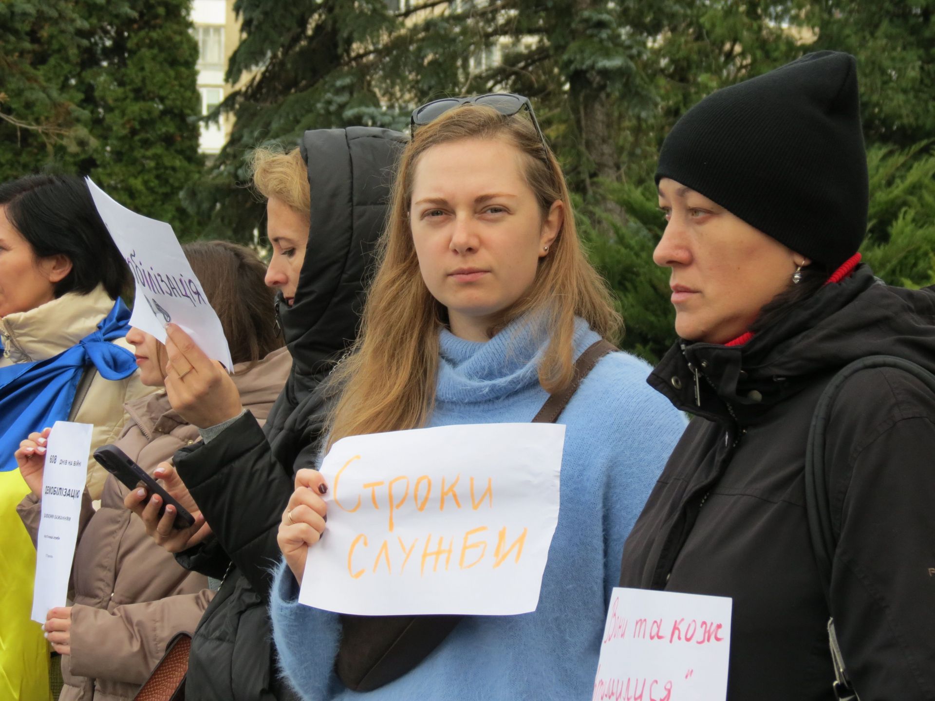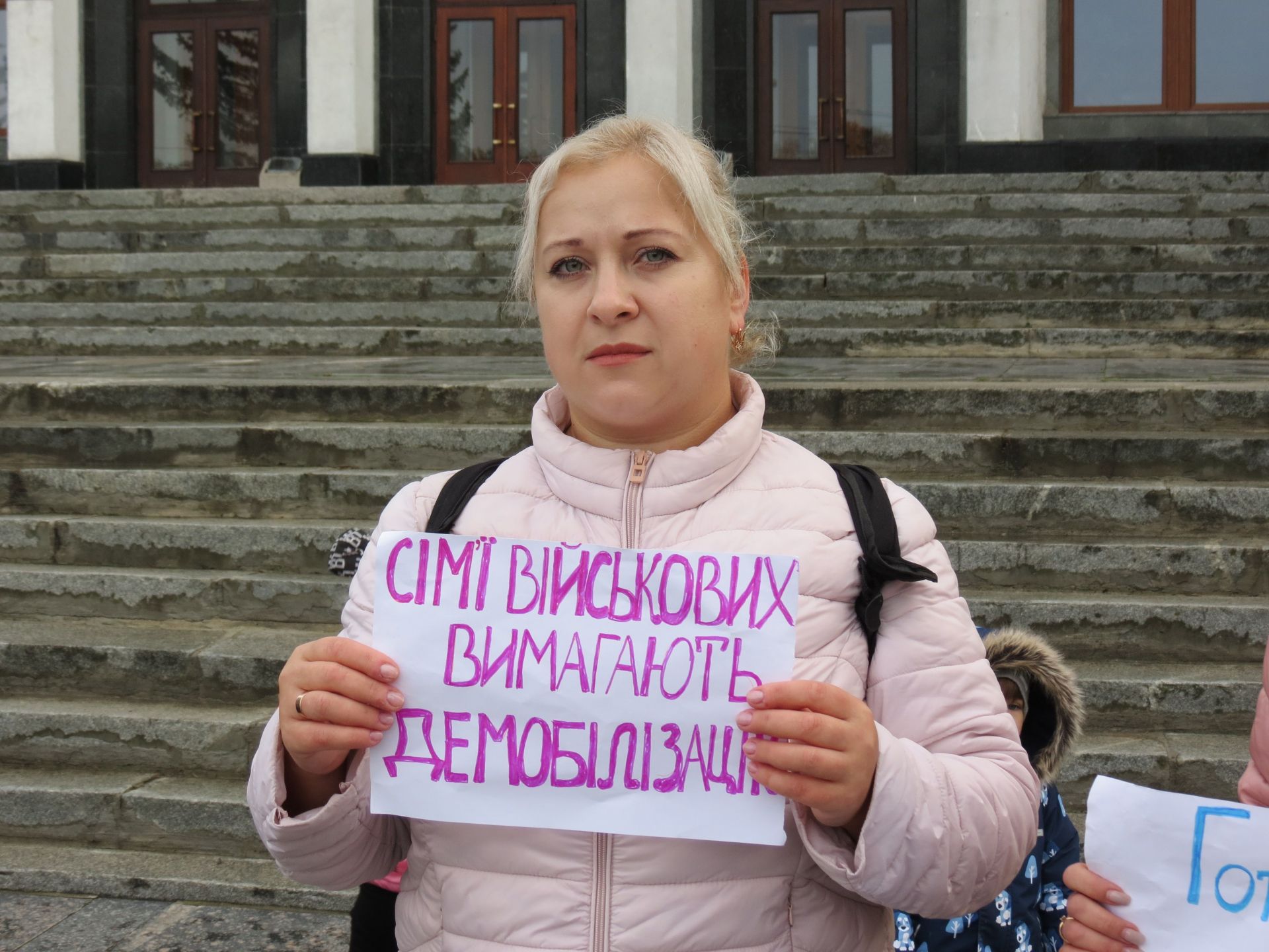 – Я дружина військовослужбовця, – розповіла учасниця акції Вікторія. – Ми хочемо, аби наші захисники мали можливість бути демобілізованими після 18 місяців служби. Хлопці втомилися, вони також мають сім'ї. Тому ми вийшли на цей мітинг з плакатами, ми збираємо підписи у перехожих, щоб передати їх президенту.