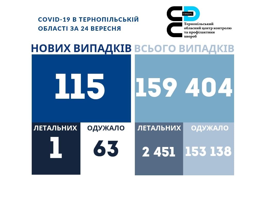 115 нових випадків коронавірусної хвороби COVID-19 зафіксовано в Тернопільській області за добу 24 вересня.