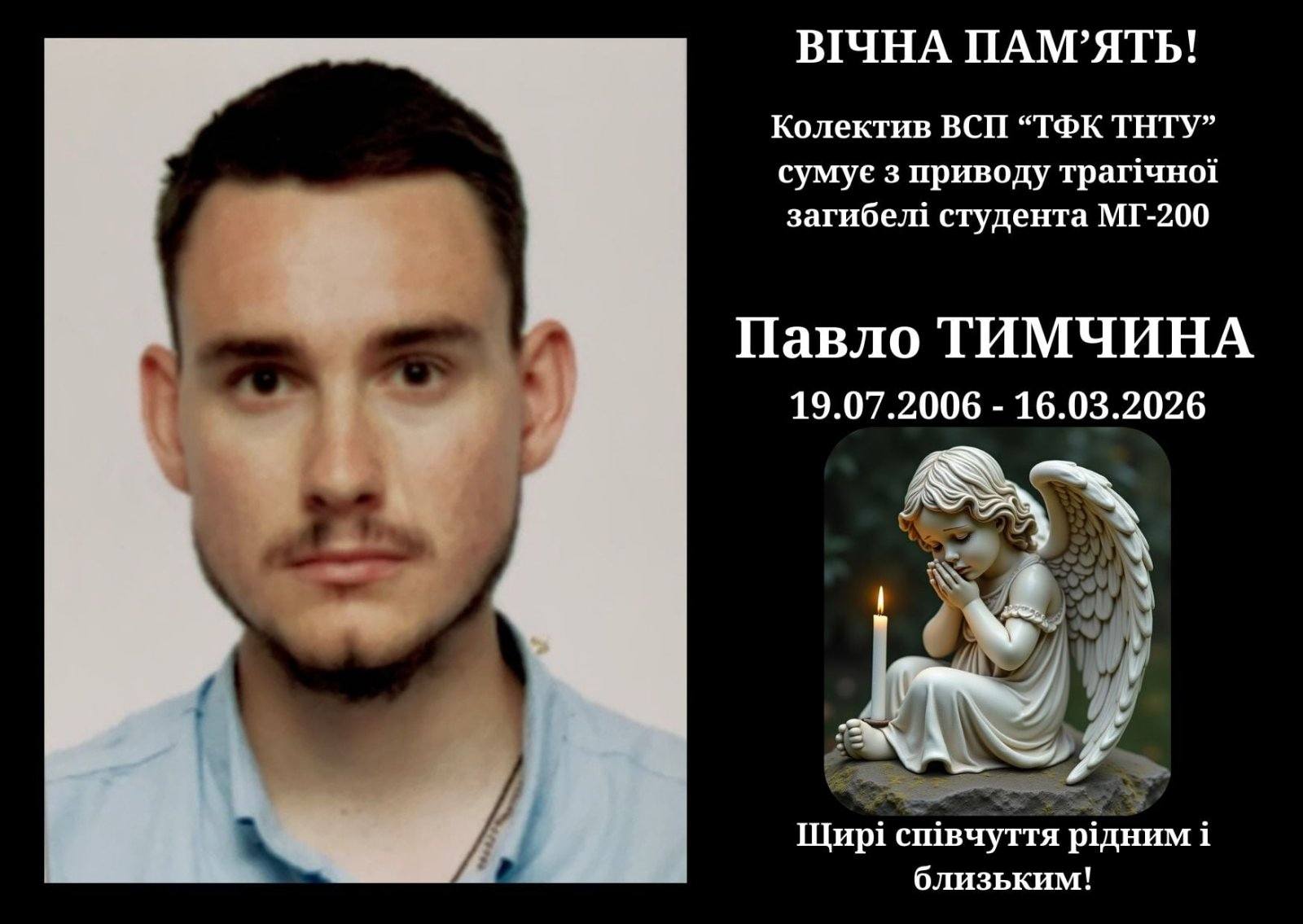 Життя студента Павла Тимчина трагічно обірвалось 16 березня 2026 року. Вічна пам'ять.