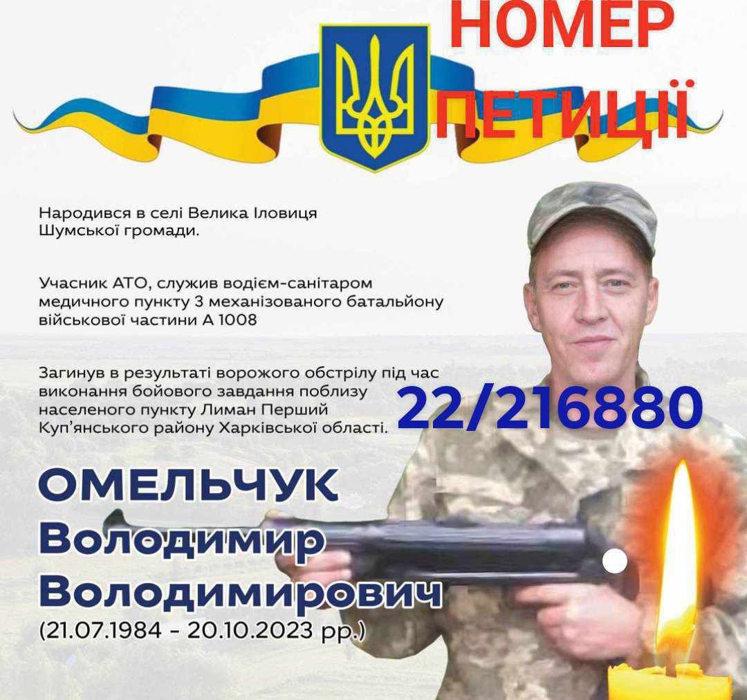 — Пане Президенте! Прошу Вас присвоїти звання Героя України (посмертно) хороброму захиснику нашої Батьківщини, моєму брату, солдату військової частини А-1008 Омельчуку Володимиру Володимировичу, який служив в 14 бригаді, 3 батальйоні імені князя Романа Великого. Мужньо визволяв Донеччину, а згодом Харківську область, — йдеться у тексті.