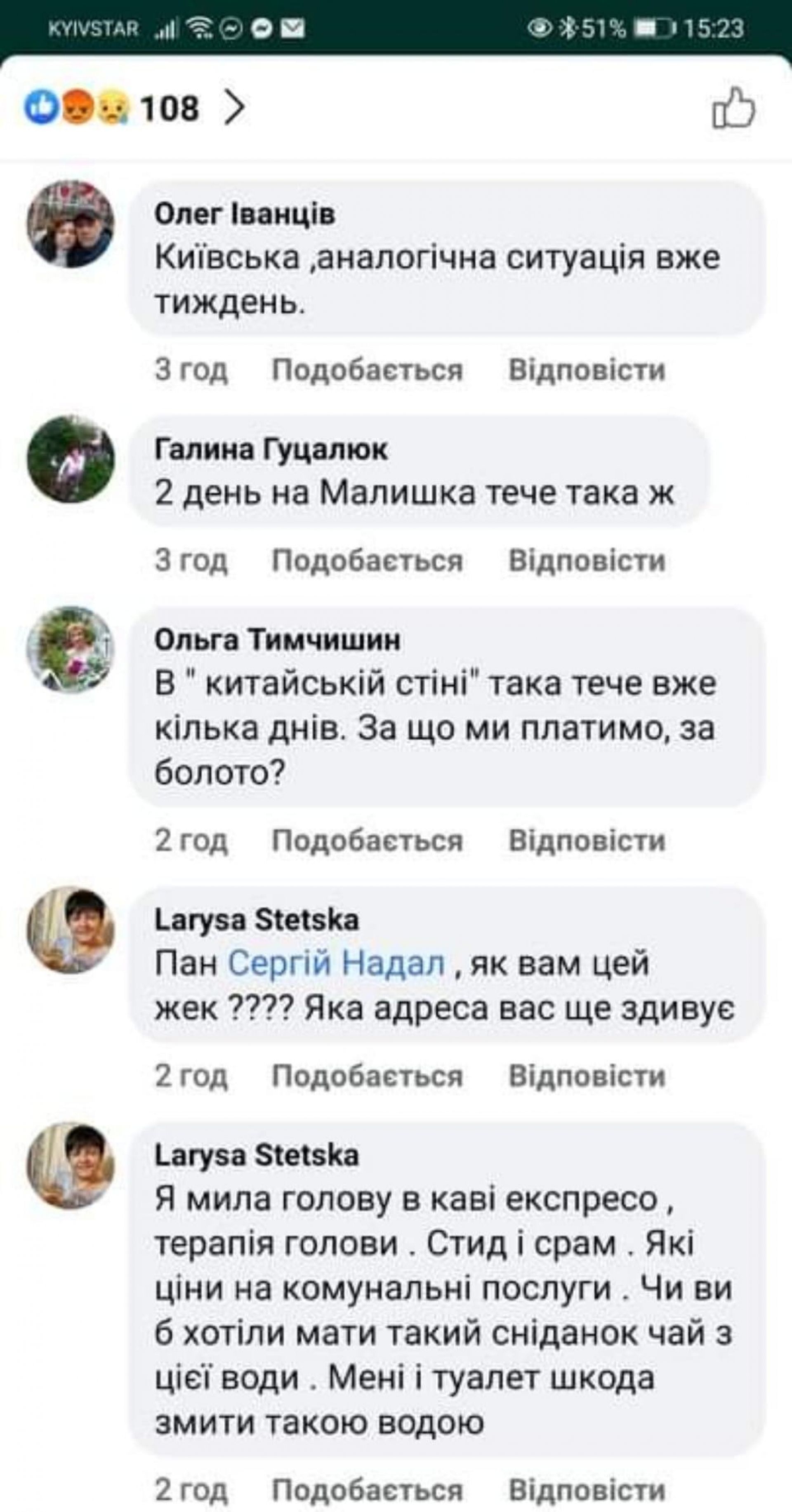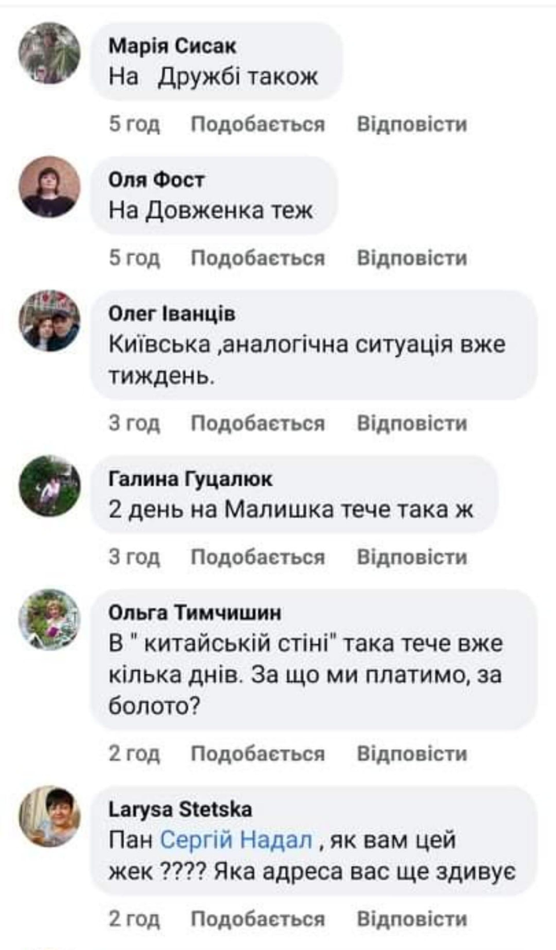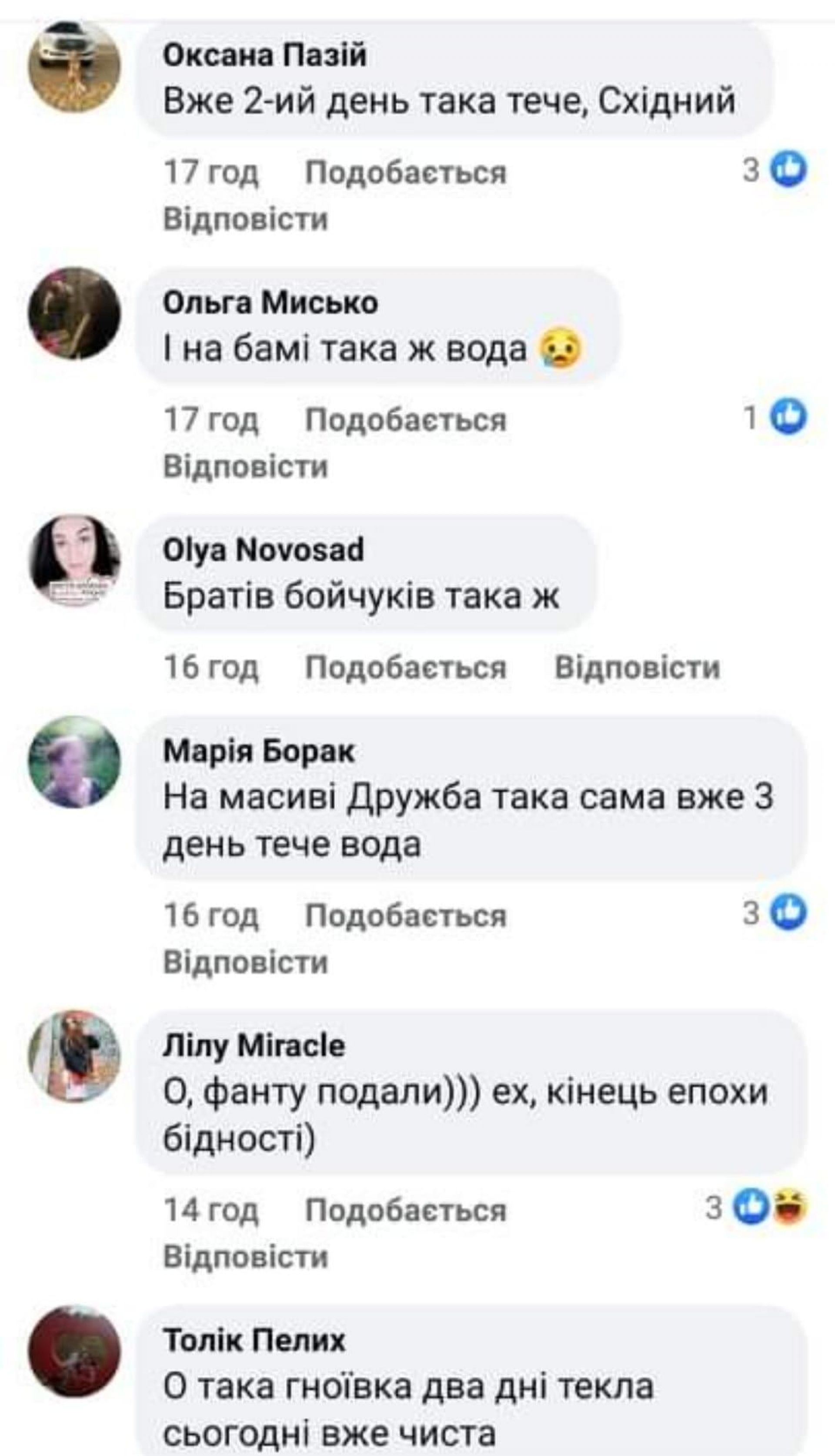 — А воно вам тре, чиста вода?!!! Яку воду заслужили таку і маємо. Хоть кілка теши, до кого тільки не жалійся. У них все добре і це все вигадки, — пише тернополянка Галина.
