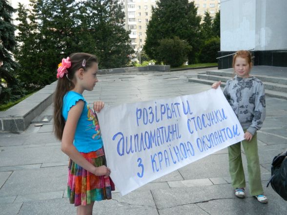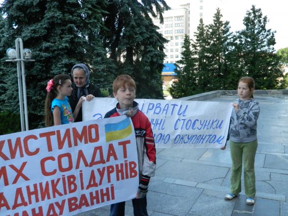 Михайло прийшов на пікет разом з двома своїми дітьми – Ганнусею та Ярославом. А також з жителькою Слов'янська Лідією Івановою та її донькою Анастасією. Всі вони переїхали до нас іще в середині квітня. Михайло Нечипоренко залишався в Слов'янську, приїхав лише два тижні тому.