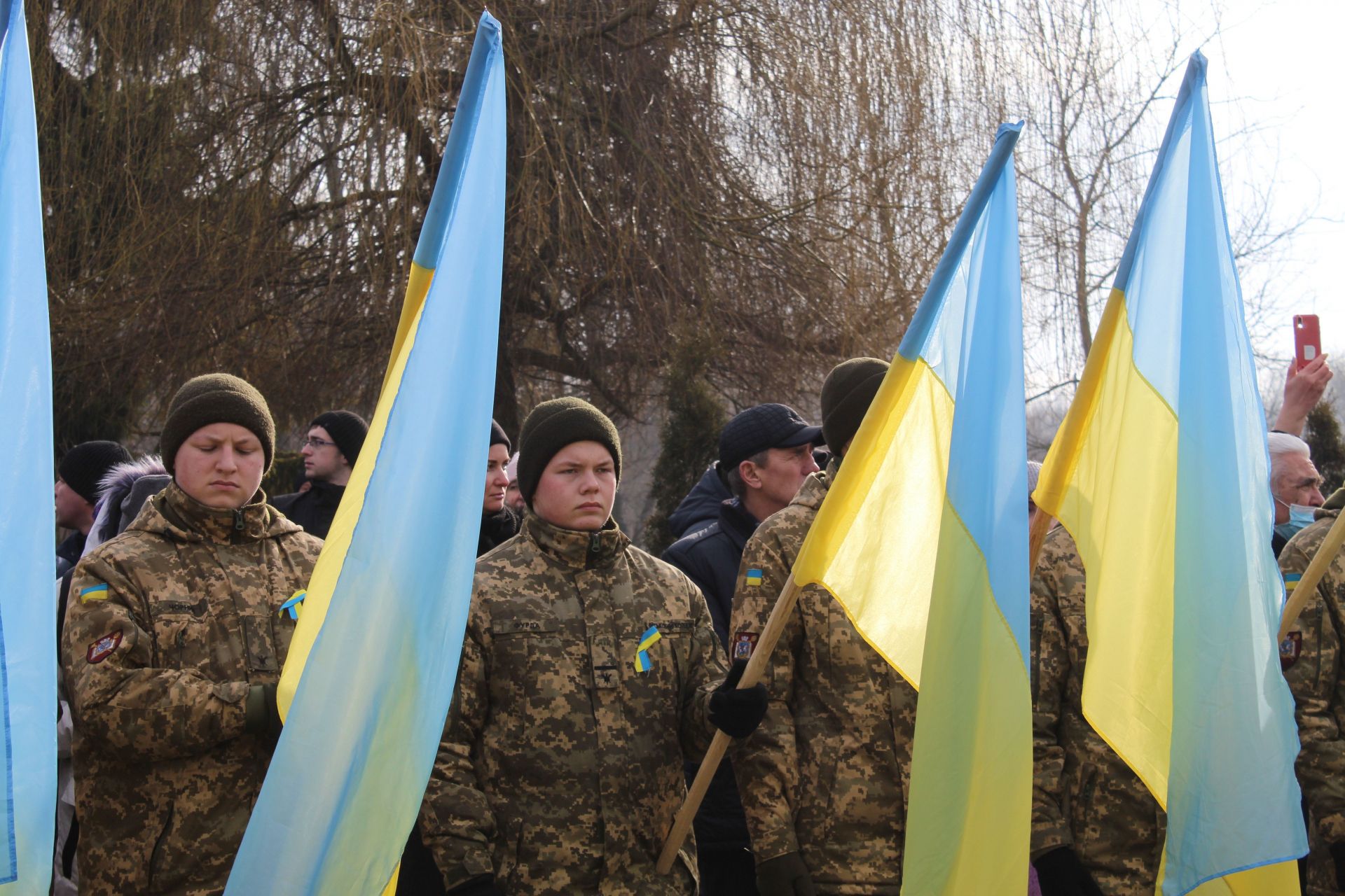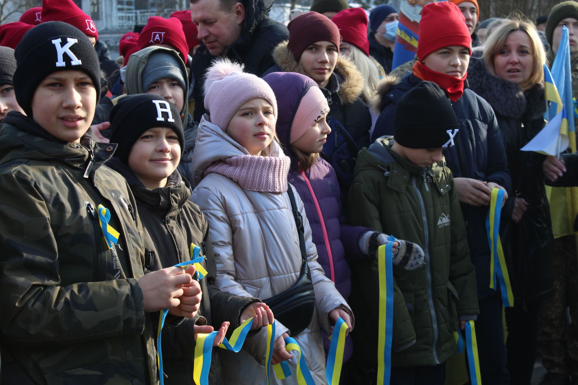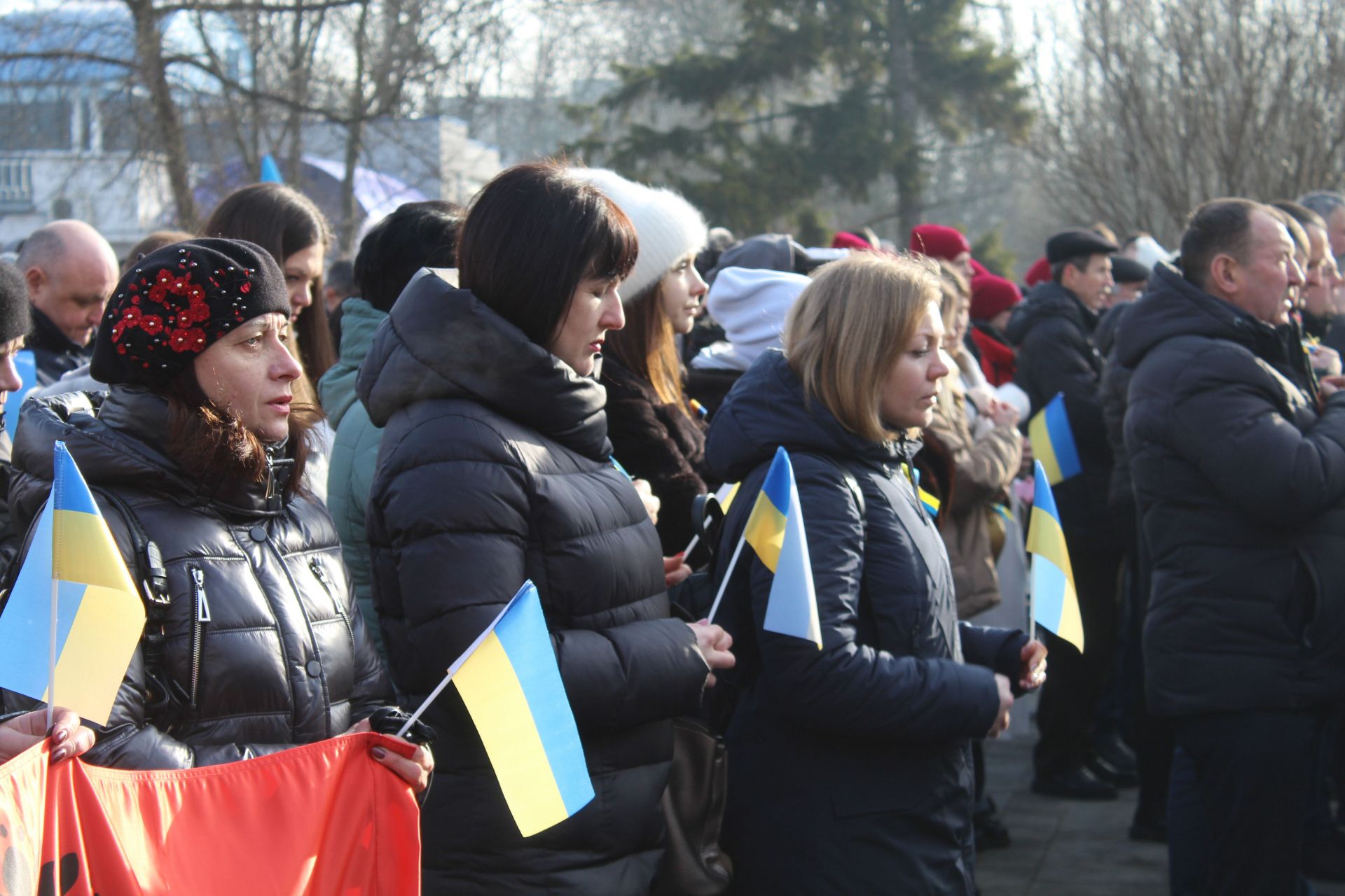 Більшість із маленькими прапорцями у руках або стрічками на грудях. Дехто навіть вирішив накинути на плечі великий жовто-блакитний стяг.