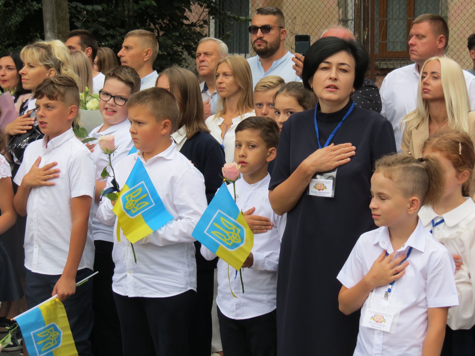 Діти разом із батьками та вчителями разом заспівали Гімн України. Після того розійшлися по класах. Сьогодні у них буде багато цікавинок, розказують педагоги.