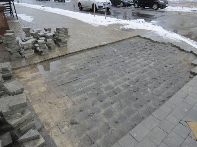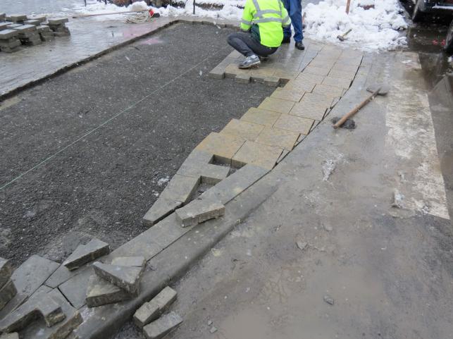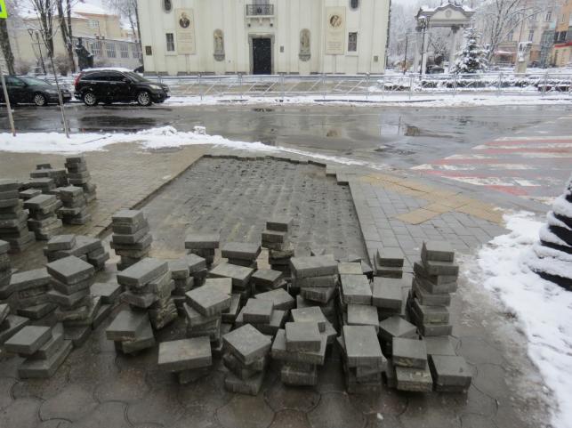 Роботи тривають на пішохідних переходах біля Тернопільського замку та біля Катедрального собору на переході до вулиці Листопадовій, 1. Там працюють робітники. Вони демонтували стару бруківку та приступили до укладання нової плитки. На одному з переходів вже знизили висоту бордюрів. Також демонтували пошкоджену плитку.