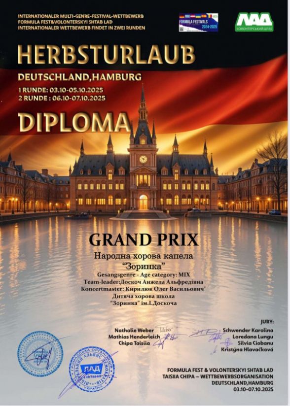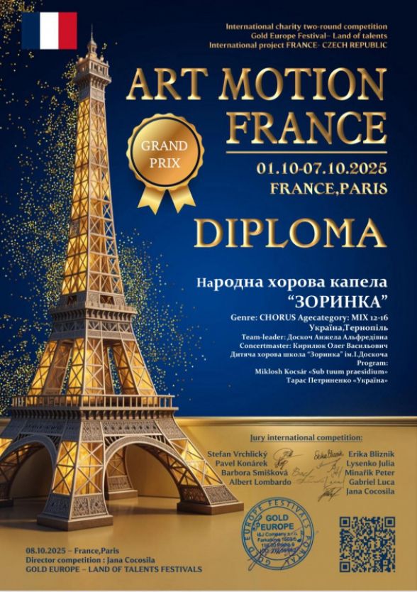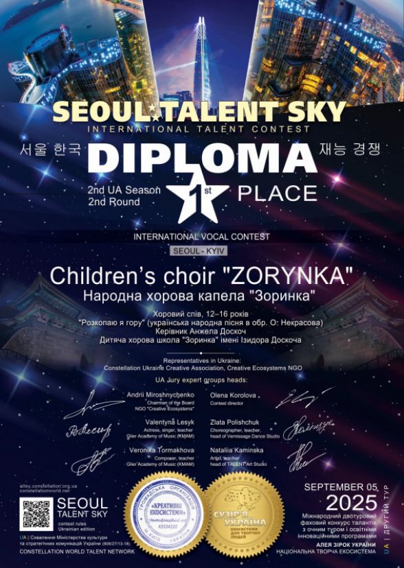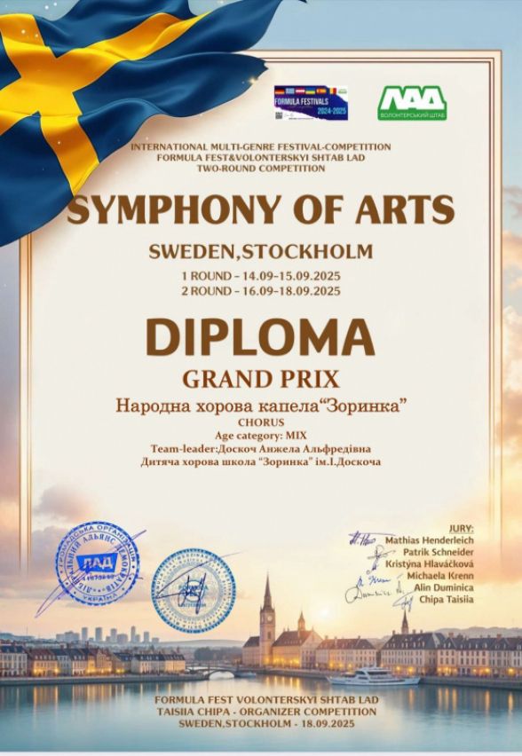 Народна хорова капела «Зоринка» завершила серію виступів за кордоном, здобувши одразу чотири престижні нагороди на міжнародних конкурсах у Швеції, Німеччині, Франції та Південній Кореї.