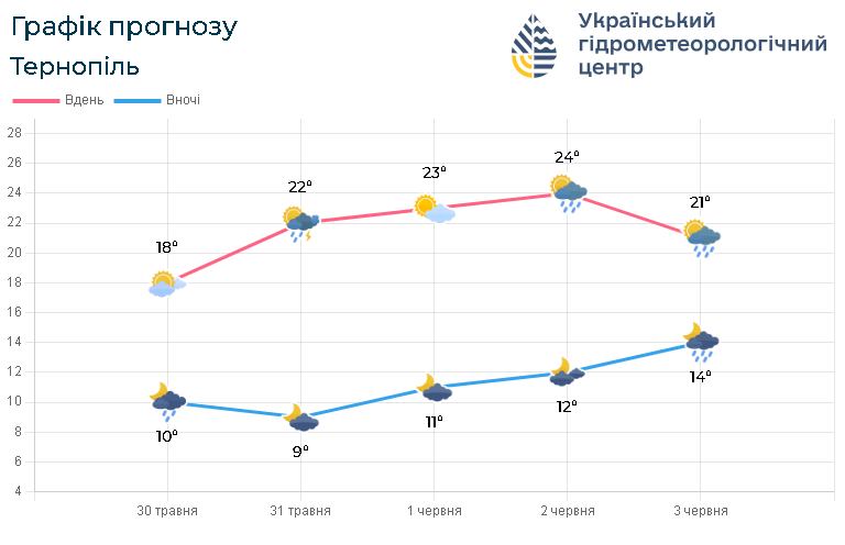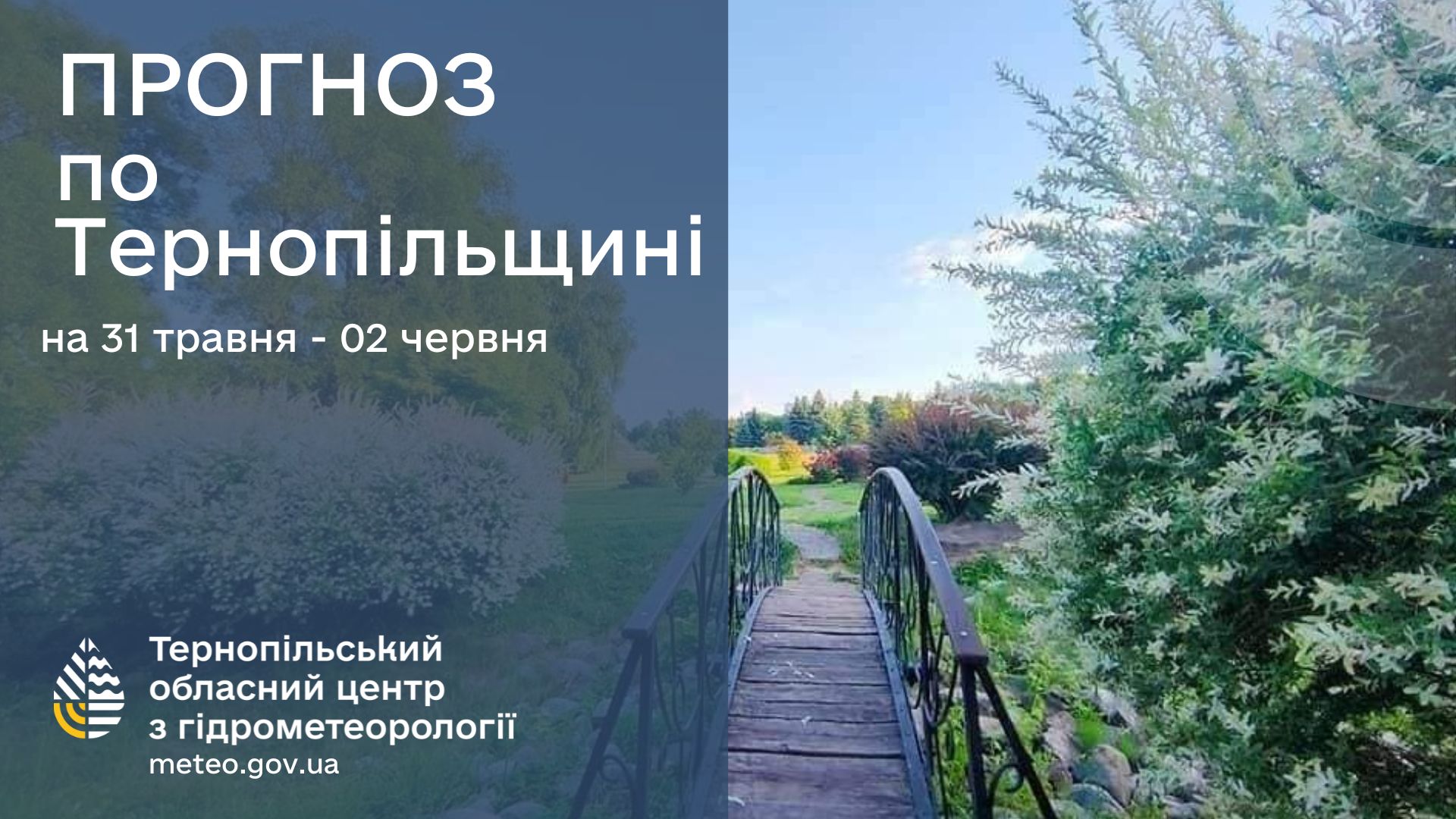 31 травня: Хмарно з проясненнями. Без істотних опадів. Вітер північно-західний, 7 – 12 м/с. Температура по області вночі 6 – 11° тепла, вдень 18 – 23° тепла; по м. Тернополю вночі 7 – 9° тепла, вдень 20 – 22° тепла.