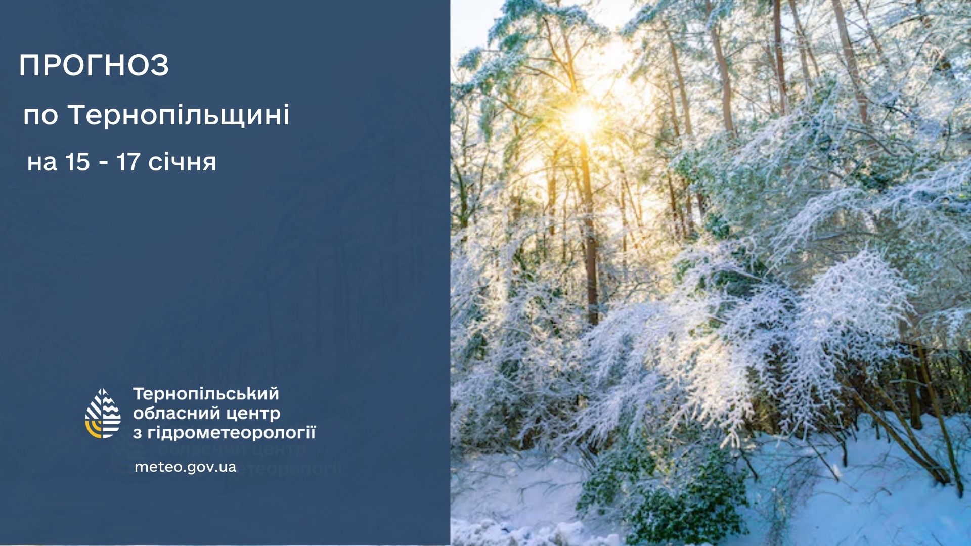 15 січня: Хмарно. Вночі часом сніг. Вдень невеликий сніг та мокрий сніг. На дорогах ожеледиця. Слабкий туман, слабке налипання мокрого снігу. Вітер південно-східний, 5 – 10 м/с. Температура по області вночі 5 – 10° морозу, вдень 0 – 5° морозу; по м. Тернополю вночі 7 – 9° морозу, вдень 2 – 4° морозу.