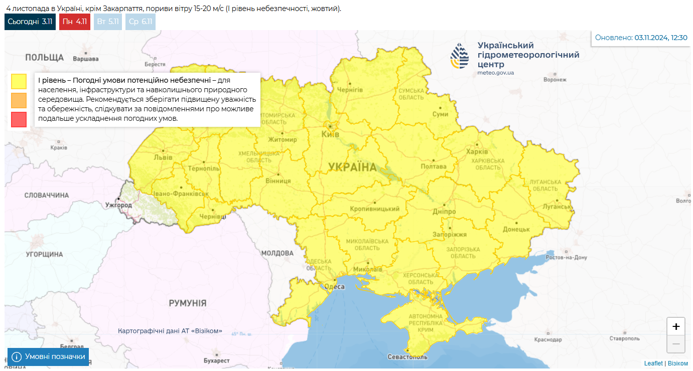 Область, місто: 4 листопада пориви північно – західного вітру 15 – 20 м/с. (І рівень небезпечності).