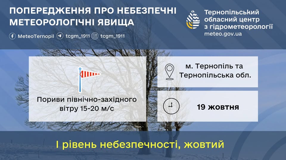 Про небезпечні метеорологічні явища І рівня небезпечності по Тернопільській області та м. Тернопіль попереджають в Тернопільському обласному центрі з гідрометеорології.