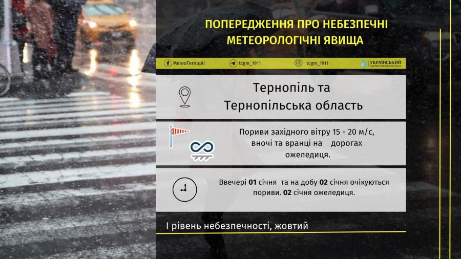 На Тернопільщині ввечері 1 січня і на добу 2 січня очікуються пориви вітру 15-20 м/с. Вночі та вранці на дорогах — ожеледиця.