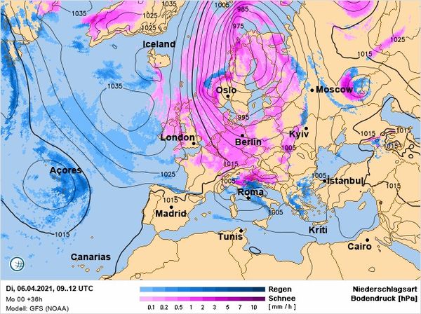 6-го квітня в західних областях України передбачається мокрий сніг (карта 2), у Карпатах можливий сильний сніг, в Житомирській, Вінницькій, Київській та Чернігівській областях - періодично невеликий дощ.