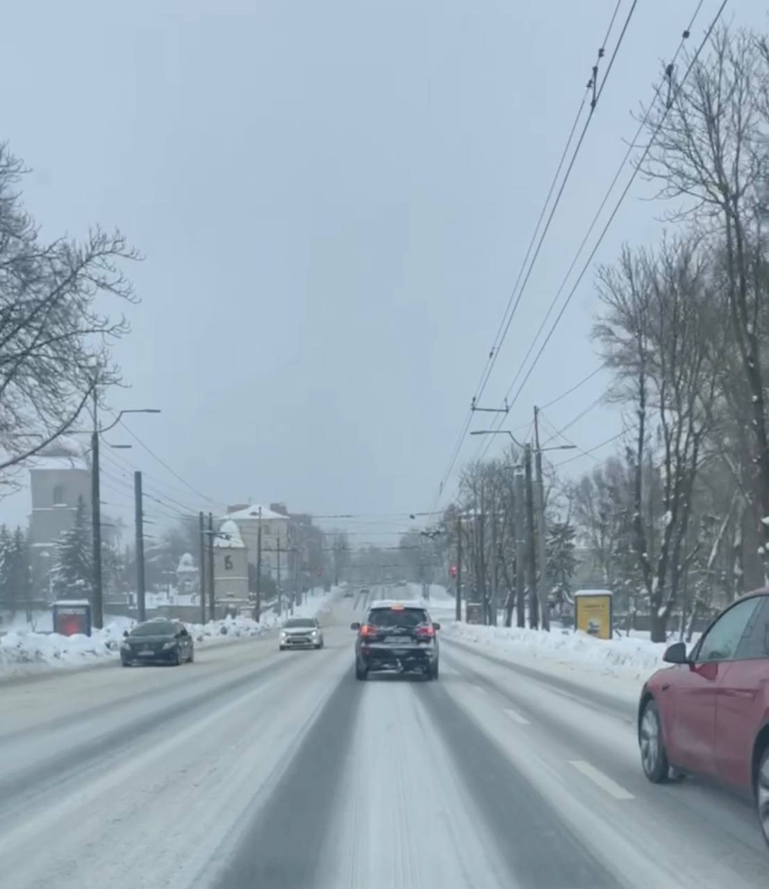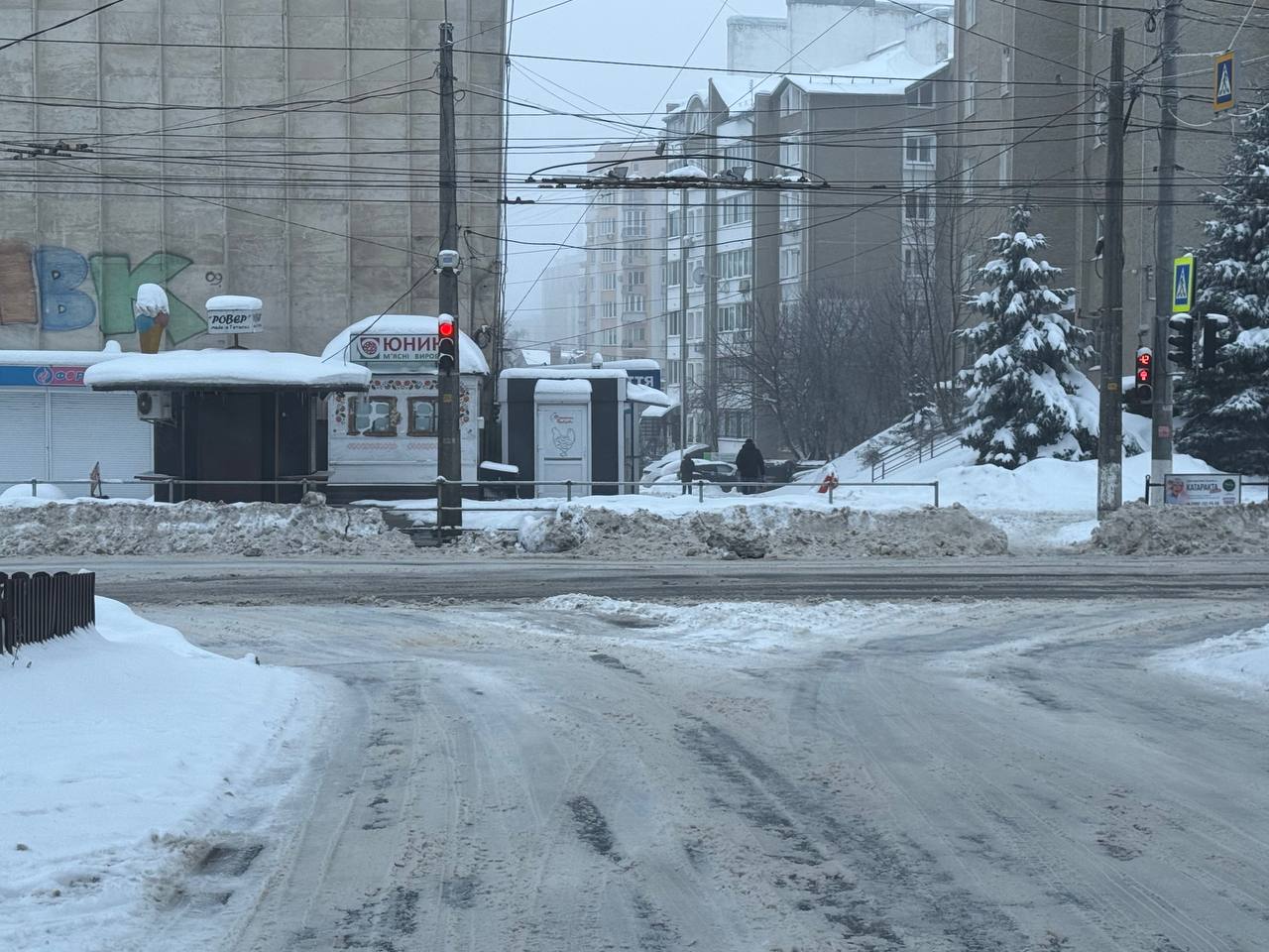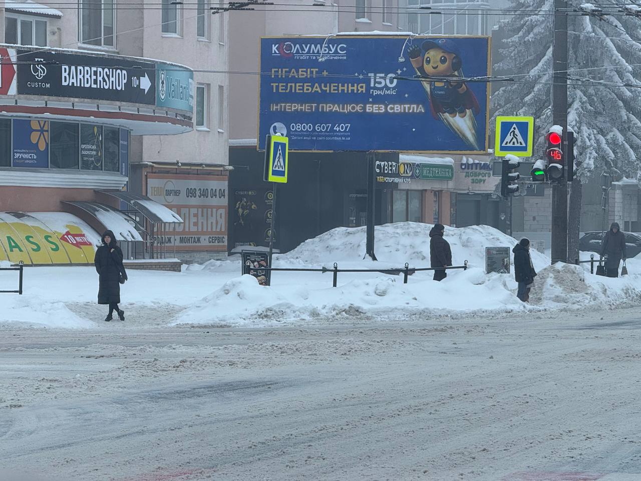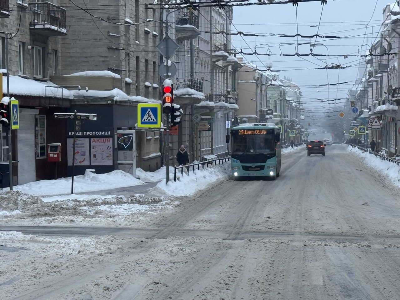 У центрі Тернополя — на вулицях Руська, Замкова, Білецька та Наливайка — дороги розчистили лише частково. Через гори снігу смуги для руху звужені. Місцями на проїжджій частині утворилася снігова каша, під якою — ожеледиця.