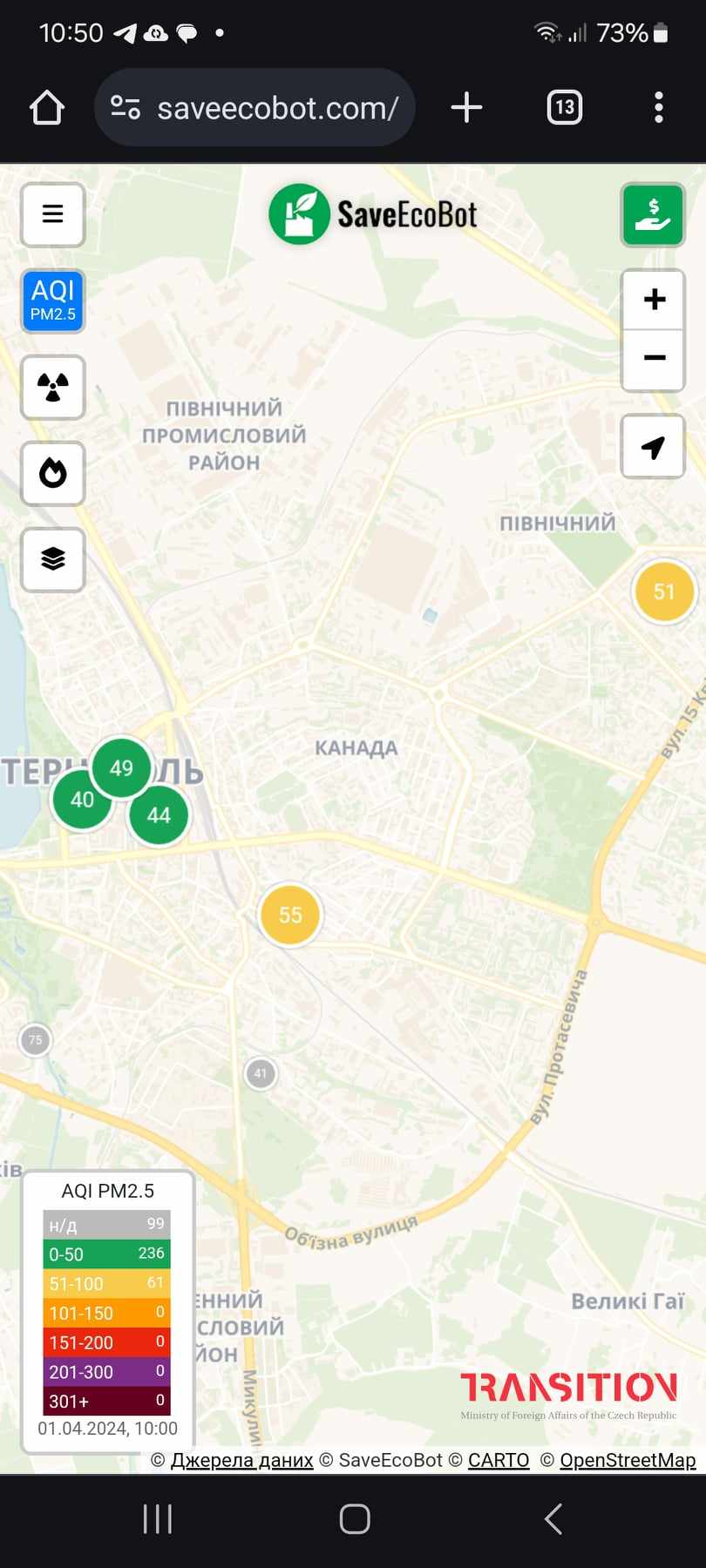 За даними сервісу saveecobot.com — карті моніторингу якості повітря в Україні, у Тернополі три з п'яти датчиків показують добрий рівень — заміри відбуваються на вулицях Грушевського, Листопадовій та Чорновола. А в районі Горбатого моста та бульварі Куліша — помірний рівень.