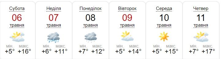 08 травня: Хмарно з проясненнями. Без істотних опадів. Вітер північно – східний, 7 – 12 м/с. Температура вночі 1 – 6° тепла, вдень 10 – 15° тепла.