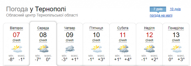 8 січня: Хмарно з проясненнями. Без істотних опадів. На дорогах ожеледиця. Вітер південно-західний, 5-10 м/с. Температура вночі 2-7о морозу, вдень від 4о морозу до 1о тепла. Таку погоду прогнозує Тернопільський обласний центр з гідрометеорології.