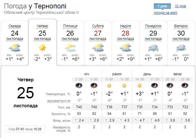 Попередньо тернопільські синоптики повідомляли, що 25 листопада: Хмарно з проясненнями. Без істотних опадів. Вітер південно-східний, 5 – 10 м/с. Температура вночі 0 – 5º морозу, вдень 2 – 7º тепла.