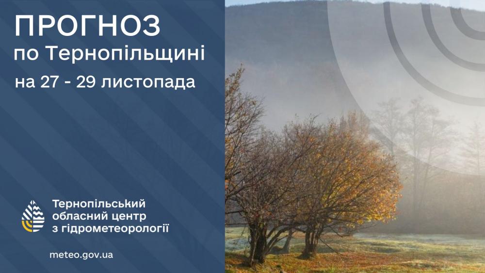 27 листопада: Хмарно з проясненнями. Без істотних опадів. Вночі та вранці слабкий туман. Вітер північно – західний, 5 – 10 м/с. Температура по області впродовж доби від 1° морозу до 4° тепла; по м. Тернополю впродовж доби 0 - 2° тепла.