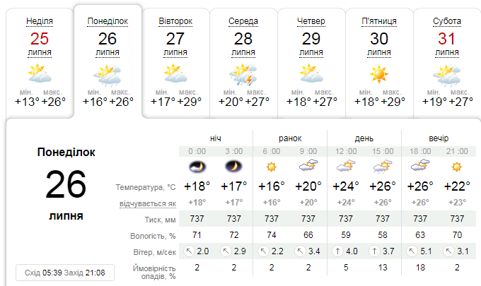 Місто: Мінлива хмарність. Без істотних опадів. Вітер південно-східний, 7 – 12 м/с. Температура вночі 14 – 16°, вдень 26 – 28° тепла.
