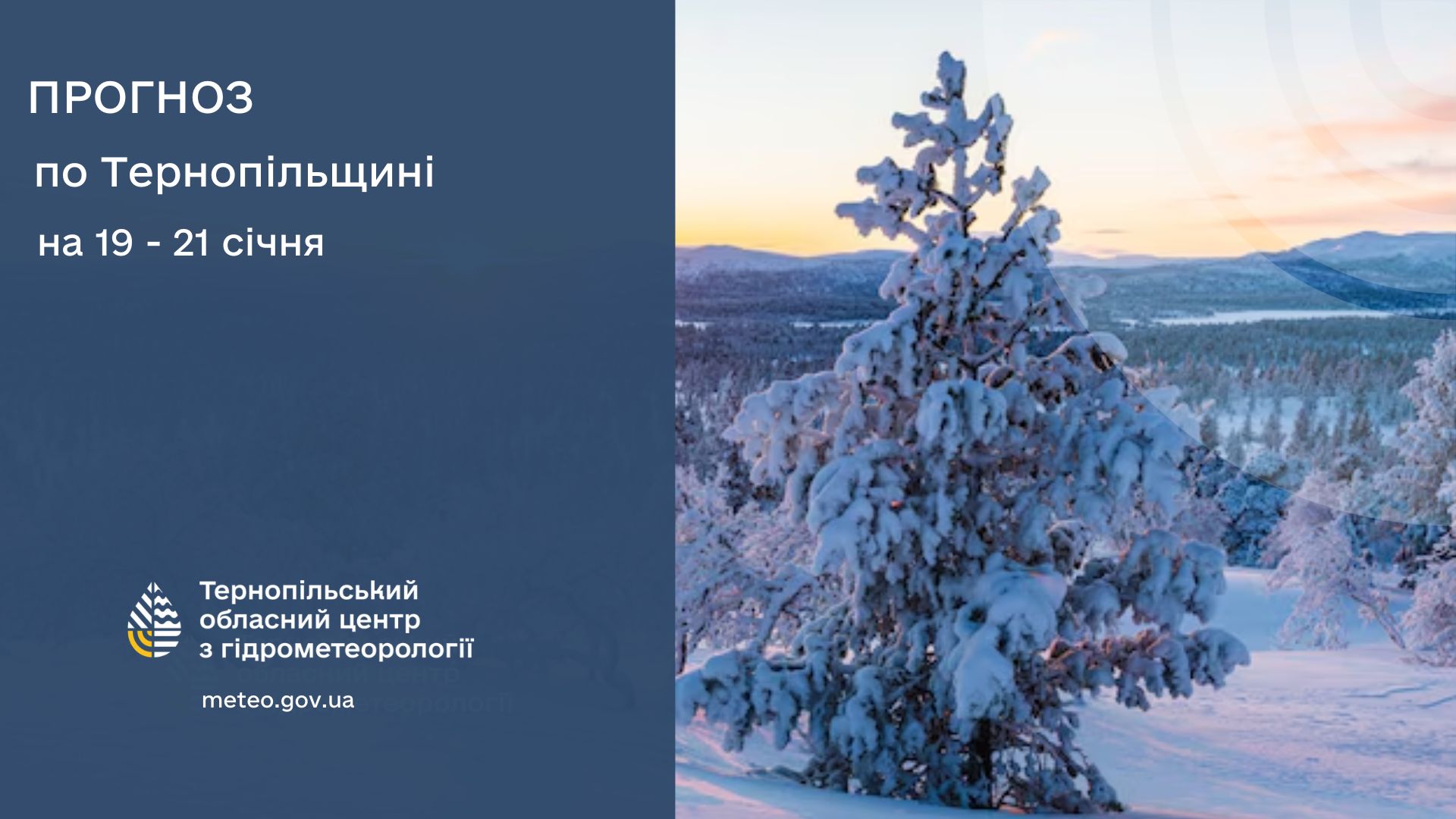 19 січня: Хмарно з проясненнями. Без опадів. На дорогах ожеледиця. Вночі та вранці туман. Слабка ожеледь. Вітер південно-східний, 5 – 10 м/с. Температура по області вночі 12 – 17° морозу, вдень 6 – 11° морозу; по м. Тернополю вночі 15 – 17° морозу, вдень 6 – 8° морозу.